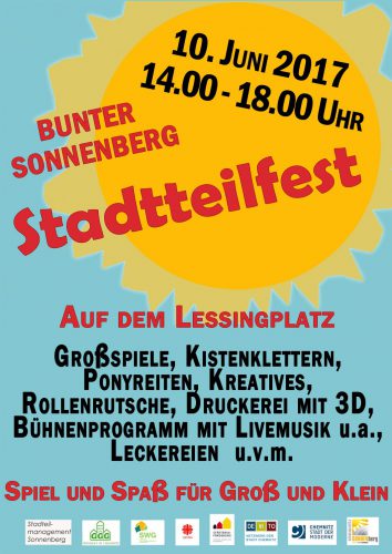 Das diesjährige Stadtteilfest wird am 10.6. von 14.00 – 18.00 Uhr auf dem Lessingplatz gefeiert. Wie jedes Jahr gestalten die Sonnenberger Vereine und Gewerbetreibende das Fest mit einer Vielfalt von Angeboten. Vor allem Kinder u. Familien werden ihren Spaß haben. Auch die etwas gesetzteren Menschen können bei Live-Musik von Vokanter, dem Duo UB, einem kleinen Zirkusprogramm und indischen Tänzen das Bühnenprogramm, einen Kaffee und das schöne Wetter genießen. Natürlich sind die Bastel- u. künstlerischen Angebote für alle da! Kistenklettern, Bobbycarstation, Ponyreiten, Hüpfburg u. viele andere Stationen werden aber eher die Kinderherzen höher schlagen lassen.