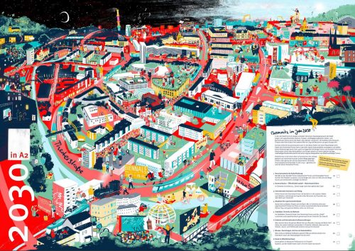Das Wimmelbild soll neugierig machen auf eine Zeitreise bis 2030, da vieles noch nicht vorhanden ist und noch Möglichkeiten für Ideen offen läßt, ohne den Bürgern etwas vorzugeben.