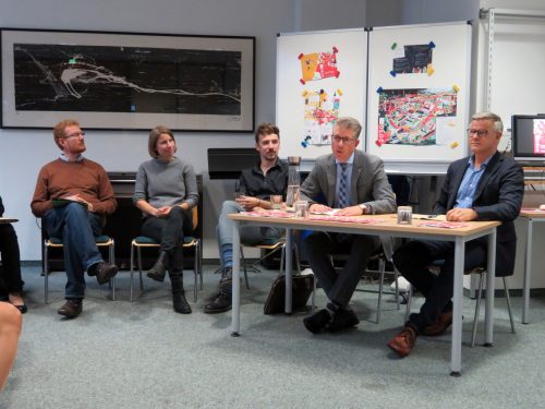 Die Titelseite A5 zeigt einen Tisch, auf dem die Linien eines Stadtplanes zu erkennen, um den entspannt Menschen mit verschieden Utensilien sitzen.