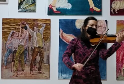 Welche Kunst gibt es? Hat sie spezielle Vorlieben bei den Kompositionen? Sie wehrt ab. „Das ist ja alles interessant, die vielen Sparten Oper, Konzert, Streichquartett, das wechselt auch je nach Stimmung.“ Neue Musik mag sie nur bis zu einem bestimmten Punkt: „Wenn sie so schwierig zu spielen ist, dass ich nicht weiß, ob sich das lohnt.“ Als Beitrag zum Interview hat sie ein Stück des Russen Alexander Glasunow herausgesucht, spielt eine Stimme aus dem Quartett. Helle, dunkle, laute, leise, langsame und schnelle Töne, lebendig und präzise – die Tanzgruppe auf dem Bild von Doreen Grün im Hintergrund gerät quasi in Bewegung.