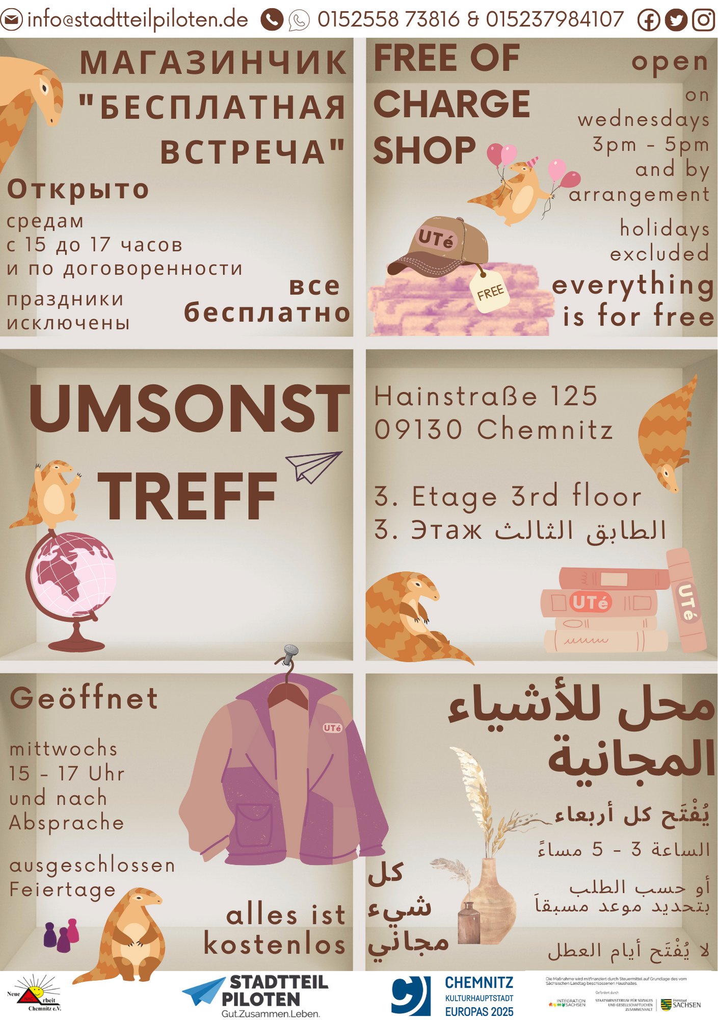 Weiterhin öffnet unser Umsonstladen „UTé“ jeden Mittwoch von 15-17 Uhr die Türen für Euch. Neben Kleidung, Spielzeug & Büchern werden auch Alltagsgegenstände wie Küchenutensilien bei uns gespendet. Komm gern vorbei und schaut Euch um. Könnt Ihr herausfinden, welche Gegenstände & Kuriositäten sich bei uns im Umsonst-Treff aktuell tummeln?