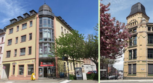 Ein Blick, wie ich ihn in meinem Bild festgehalten habe, bietet sich von der Treppe an der Schule gegenüber. Den modernen, verglasten Turm des Gebäudes gegenüber von der früheren Fabrik, in dem sich das „Café Maulwurf“ befindet, hat man mit Einfühlungsvermögen dem Alten angepasst. Hier warten immer viele Leute auf den Bus, haben sie einmal die Schönheit ihrer Umgebung wahrgenommen? Es ist eine Situation fast wie in südlichen Ländern, fehlen nur noch die Leute vor dem Café, die die Sonne genießen…