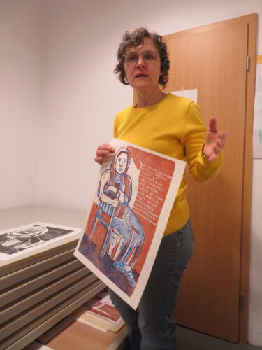 Ein Unikat aus einem Workshop ist das Bild einer Statue der „Heiligen Elisabeth von Thüringen“: Es ist eine Cola-Lithographie – Alufolie mit Coca-Cola geätzt und gedruckt. Wie diese Frau sich vor 800 Jahren caritativ betätigt hat, reflektiert die Künstlerin Hain: „Unser Sozialsystem gab es damals noch nicht, aber damals wie heute macht helfen Freude.“