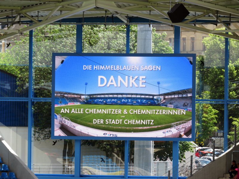 Am 18. Juni 2016 war es nach zweieinhalbjähriger Bauzeit endlich soweit, dass das neue Stadion, das ca. 27 Millionen Euro gekostet hat, eröffnet wurde. Bis zu diesem Zeitpunkt hatten 53 Firmen, davon allein 19 aus dem Raum Chemnitz und 15 weitere aus Sachsen, am Bau mitgewirkt. Das Stadion hat eine Kapazität von 15.479 Plätzen, davon 7.642 Sitzplätze, 6.254 Stehplätze, 999 Businessplätze, 60 Rollstuhlplätze und 60 Plätze für Begleitpersonen sowie 63 Presse- und Kommentatorenplätze. Das CFC-Logo am Hauptgebäude ist 36 m² groß, das Stadion wird mit Flutlicht von 4 Masten mit jeweils 25 Scheinwerfern beleuchtet und die Spielereignisse können auf eine 39 m² große Videowand übertragen werden.