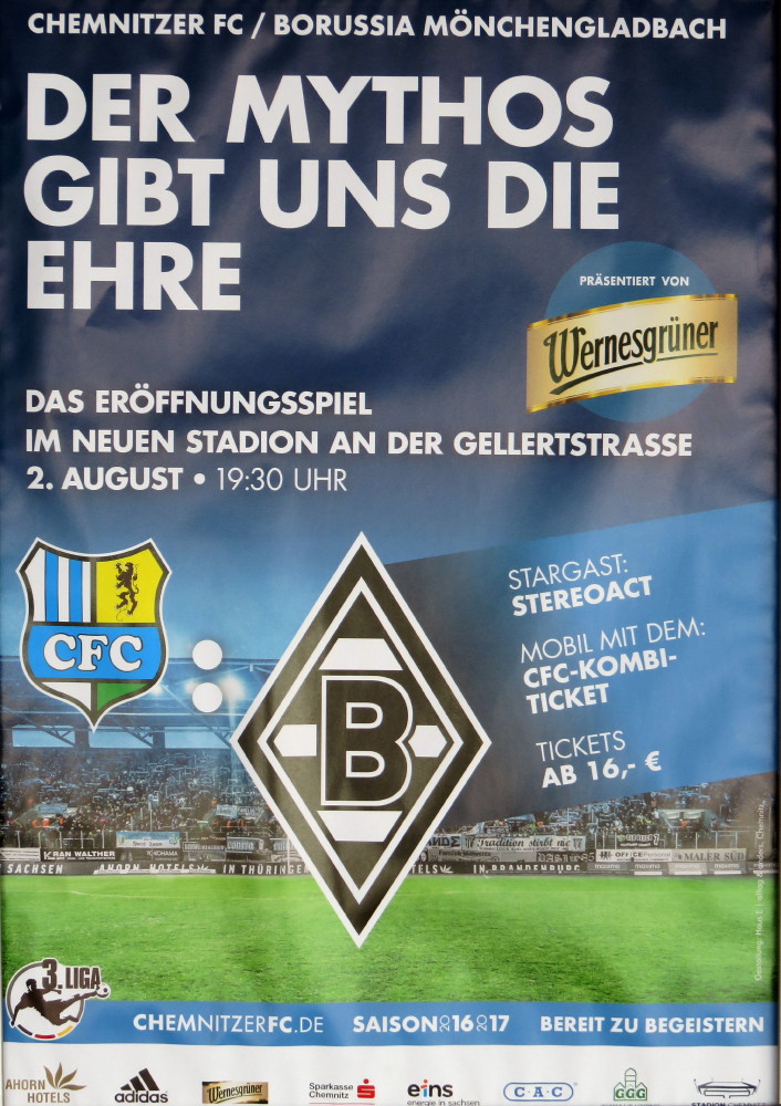 Das offizielle Eröffnungsspiel am 2. August 2016 zwischen dem Chemnitzer FC und Borussia Mönchengladbach, Teilnehmer an den Play-Off-Spielen für die Champions League 2016/2017, wurde zu dem erhofften großen Ereignis und Höhepunkt. 14.684 Zuschauer füllten das Stadion, das auf dem Hauptgebäude auch bereits den neuen Namen als Provisorium zeigte.
