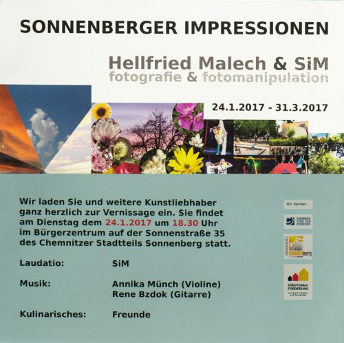Monatelang hatten Hellfried Malech und SiM (Maya Müller) an der Ausstellung gearbeitet. Nachdem Hellfried Malech in Zusammenarbeit mit S.i.M im KaffeeSatz das erste Mal seine Bilder gezeigt hatte, sollte eine weitere Präsentation für das Bürgerzentrum und darüber hinaus erarbeitet werden. Warum Fotomanipulationen? „Das lag an Hellfrieds Traum, seine 200.000 Fotos in eine einzige Ausstellung zu bringen“, erklärte SiM mit einem Augenzwinkern. So wurden Blumen, Sonnenuntergänge, Personen, Gebäude und anderes ausgewählt und zusammenkomponiert. „Hellfried danke ich, dass er mir die Chance gegeben hat“, sagte SiM.