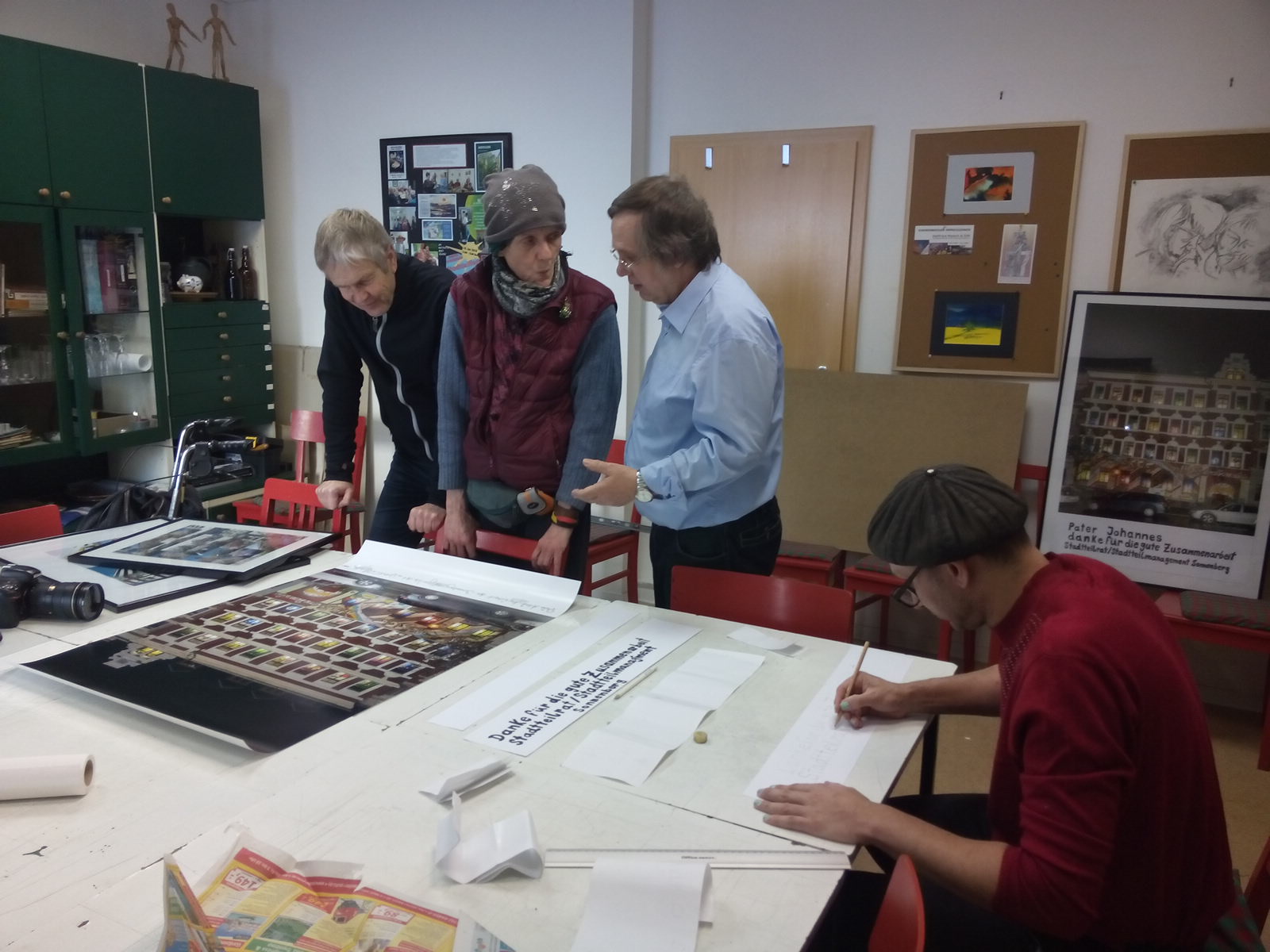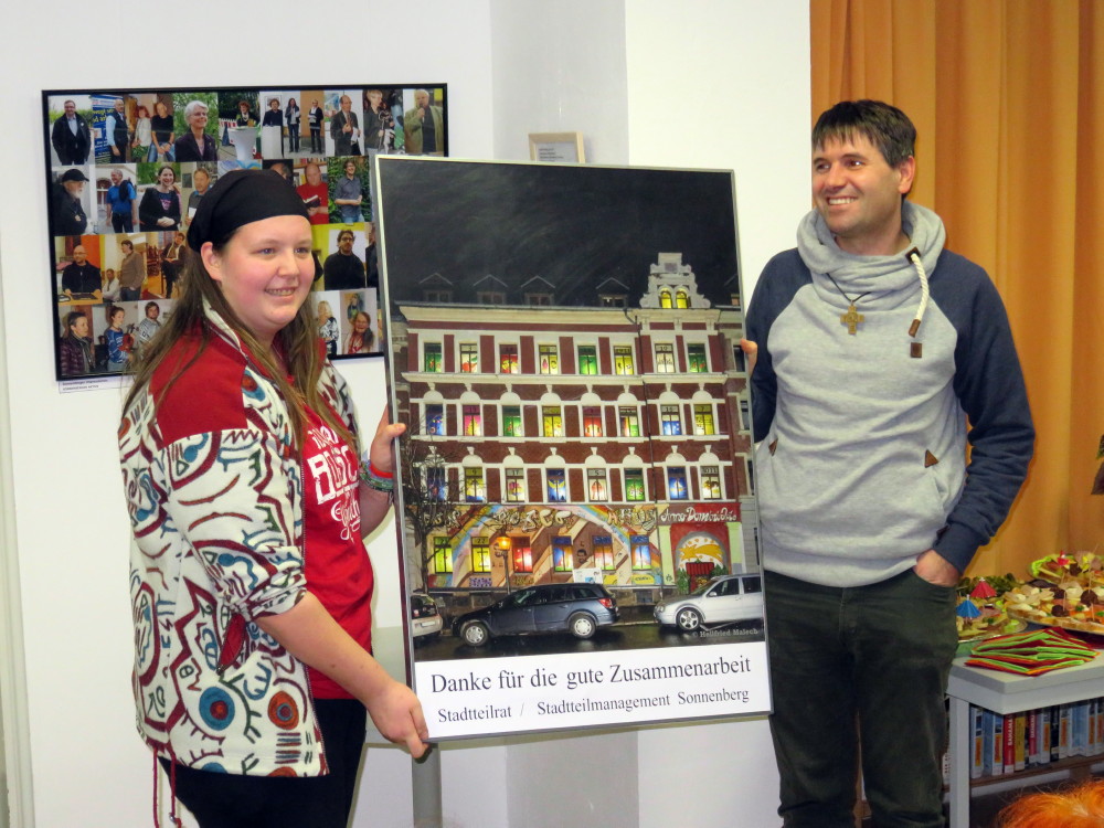 Begeistert war Malech auch von dem ersten und riesengroßen Adventskalender, den das Don Bosco-Haus in der Weihnachtszeit in der Ludwig-Kirsch-Straße organisiert hatte. Ein ganzes Haus erstrahlte mit Motiv-Fenstern. Er fotografierte und montierte das Bild, wie es sich am Heiligabend zeigte, als alle Fenster erleuchtet waren, und besorgte Abzüge im Rahmen: Für das Don-Bosco-Haus, das mit Jugendlichen und Kindern die Bilder gestaltet hatte, für den Leiter Pater Johannes, der Chemnitz bald verlässt, und in kleinem Format auch noch für den Beleuchtungstechniker. Für Pater Johannes, der mit einer der Jugendlichen zur Vernissage gekommen war, eine gelungene Überraschung.