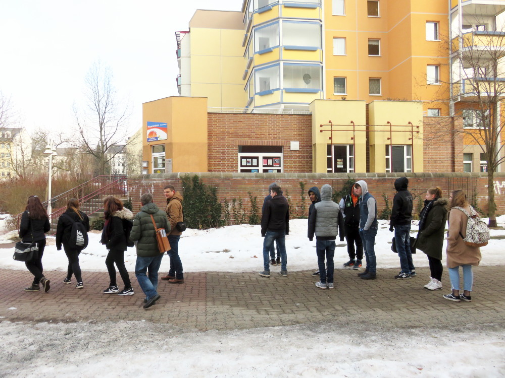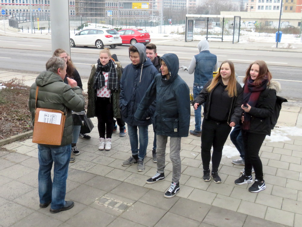 Trotz empfindlicher Kälte bewiesen die beiden Klassen, die den Rundgang gegenläufig bestritten, unterwegs wie auch bei dem Vortrag sehr gute Disziplin.