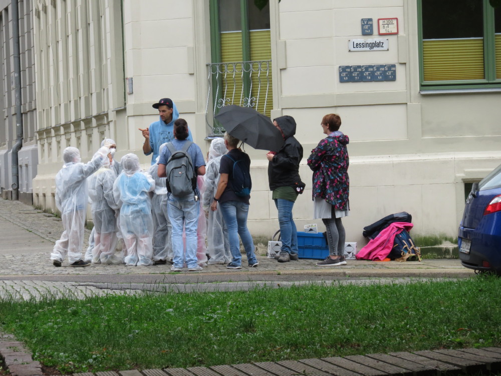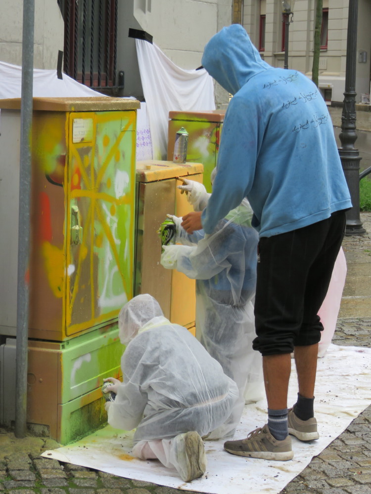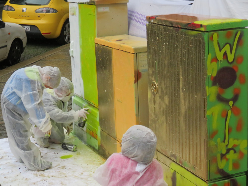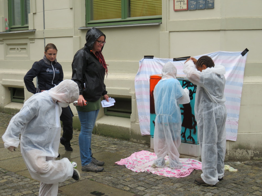 Organisiert wurde es von der mit der Mobilen Jugendarbeit Chemnitz Mitte des AJZ. Auch Eltern hatten es sich nicht nehmen lassen, ihren Kindern beim Sprayen zuzuschauen. Bei schönem Wetter ist es kein Problem, aber am Donnerstag, den 29.6.2017, regnete es praktisch ununterbrochen. Das hinderte aber die kleinen Künstler nicht, mit Begeisterung unter Anleitung von Benjamin Sprunk die grauen Kästen in bunte Objekte zu verwandeln.