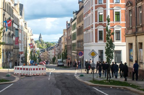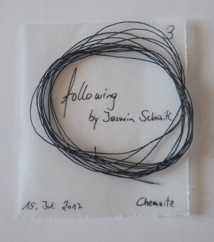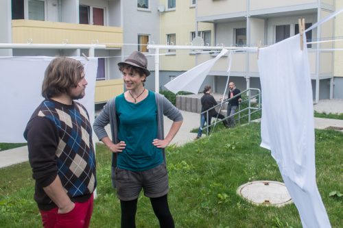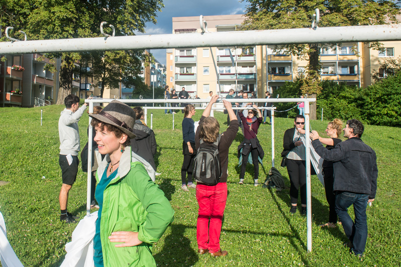 Mit der Eröffnung von zwei weiteren künstlerischen Arbeiten und einer Ausstellung wurde die Reihe Dialogfelder am 15. Juli 2017 auf der südlichen Zietenstraße in Chemnitz komplettiert.Jasmin Schaitl (Wien) war bereits seit Anfang des Monats auf dem Sonnenberg aktiv und strich in die Jahre gekommene Wäschestangen und stickte in der Öffentlichkeit. Diese Tätigkeiten waren Türöffner, um mit den Anwohner*innen des südlichen Sonnenbergs ins Gespräch zu kommen und aus den Erfahrungen eine Arbeit zu entwickeln, welche nun aufgeführt wurde.