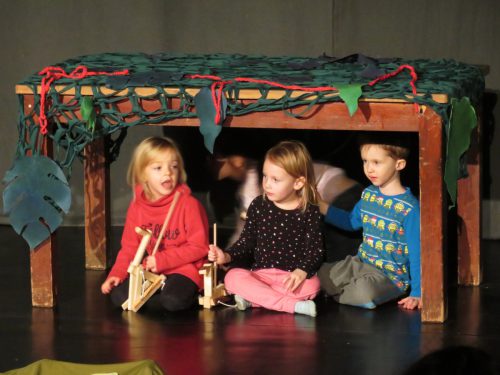 Ein besonderes Erlebnis kurz vor Weihnachten war die Aufführung von „Tarzan“ im KOMPLEX. Die Geschichte erzählt von Liebe, Empathie und Verantwortung. Tarzan ist ein theaterpädagogisches Projekt im Rahmen von „Kita und Künstler“, das besonders wichtig auch für die Kindergartentagesstätte Martinstraße 17 ist. Nachdem endlich Fördermittel durch die Stadt Chemnitz bewilligt wurden, übte Heda Bayer vom KOMPLEX mit Kindern der Kita das Stück „Tarzan“ ein. Dazu wurden Lieder einstudiert, mit Gitarrenbegleitung von Angela. Das war aber bei weitem nicht alles, denn die für das Spiel benötigten Marionetten bastelten die Kinder selbst, sägten, leimten und nagelten, bis alles fertig war.
