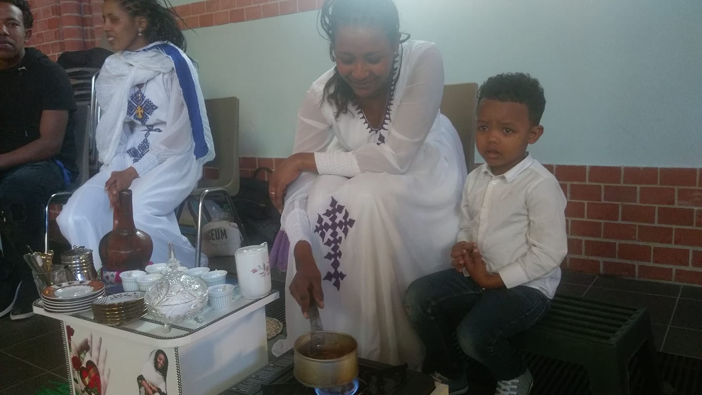 Mitglieder der christlichen eritreischen Gemeinde Chemnitz zeigten die traditionelle Kaffeezeremonie. Da duftete der frische geröstete Kaffee in der Pfanne. Die Frauen und Männer in traditionelle weißen, bestickten Kleidern haben das erste Mal mit einem Beitrag an einer Veranstaltung in Deutschland teilgenommen. Sie freuten sich über das Interesse und kommen gerne wieder in die Kirche.