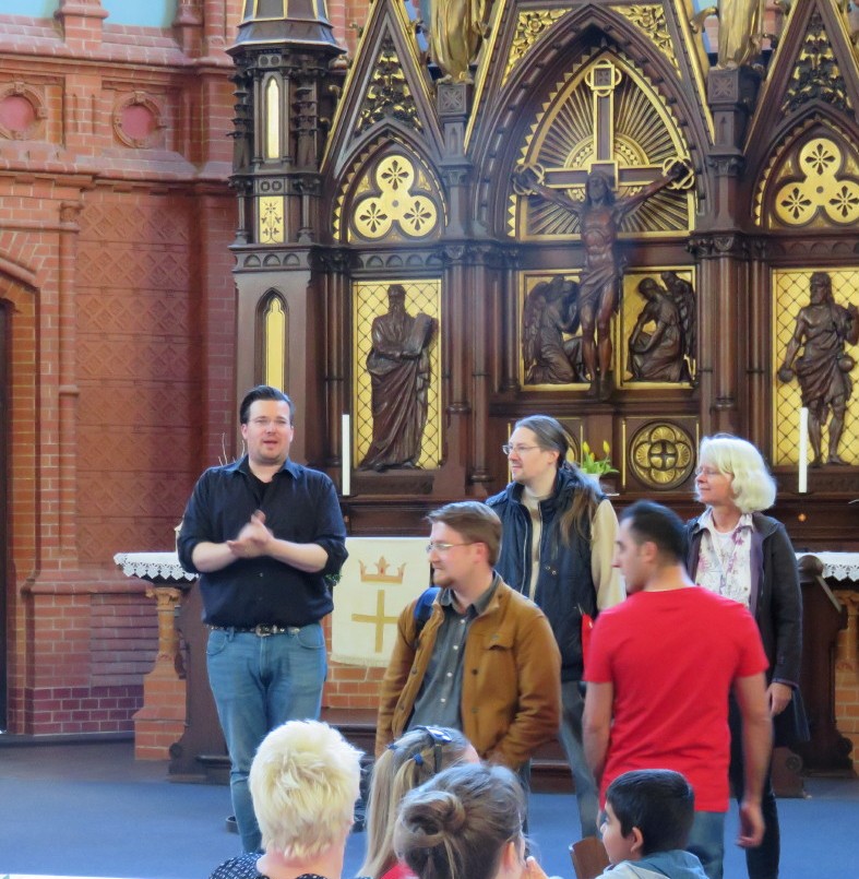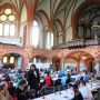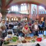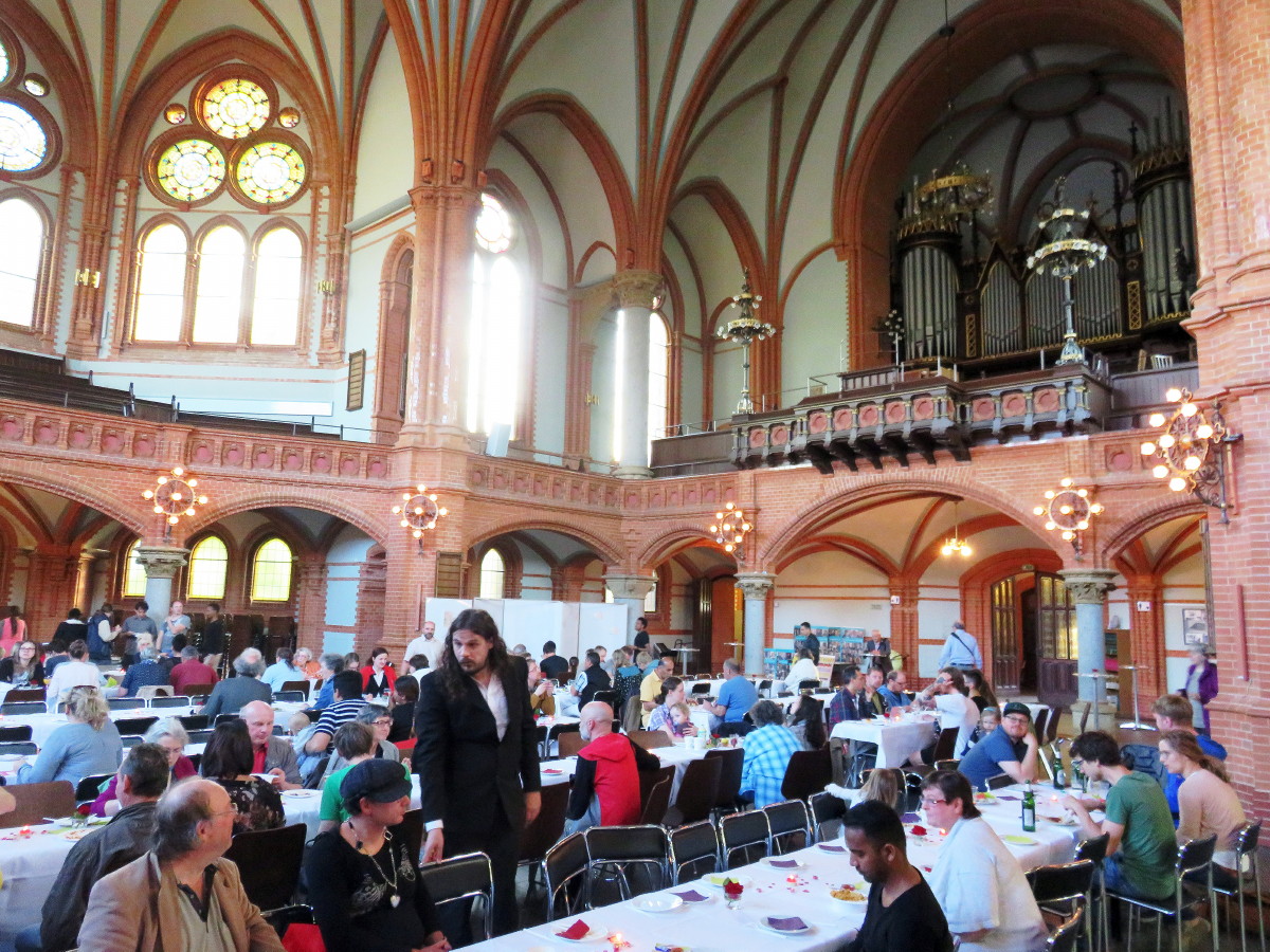 In der Markuskirche war am Vorabend des 1. Mai die Liebe das Thema, so wie es für die Feier des 875jährigem Stadtjubiläum in dieser Region vorgeschlagen wurde. Und zwar diesmal die Liebe, die durch den Magen geht, die sich in liebevoll zubereitetem Essen zeigt. Etwa 300 Gäste speisten an langen weiß gedeckten Tischen. Zu dem Buffet hatten die allermeisten etwas beigesteuert. Historisch wie Rippchen und Sauerkraut, sächsische Quarkkeulchen, Liebes-Herzkekse mit rotem Zuckerguss. Oder Schnittchen oder das Lieblingsrezept für Nudelsalat oder Spargelquiche. Eritreer, Iraner, Afghanen und Syrer hatten ihre Spezialitäten mitgebracht.