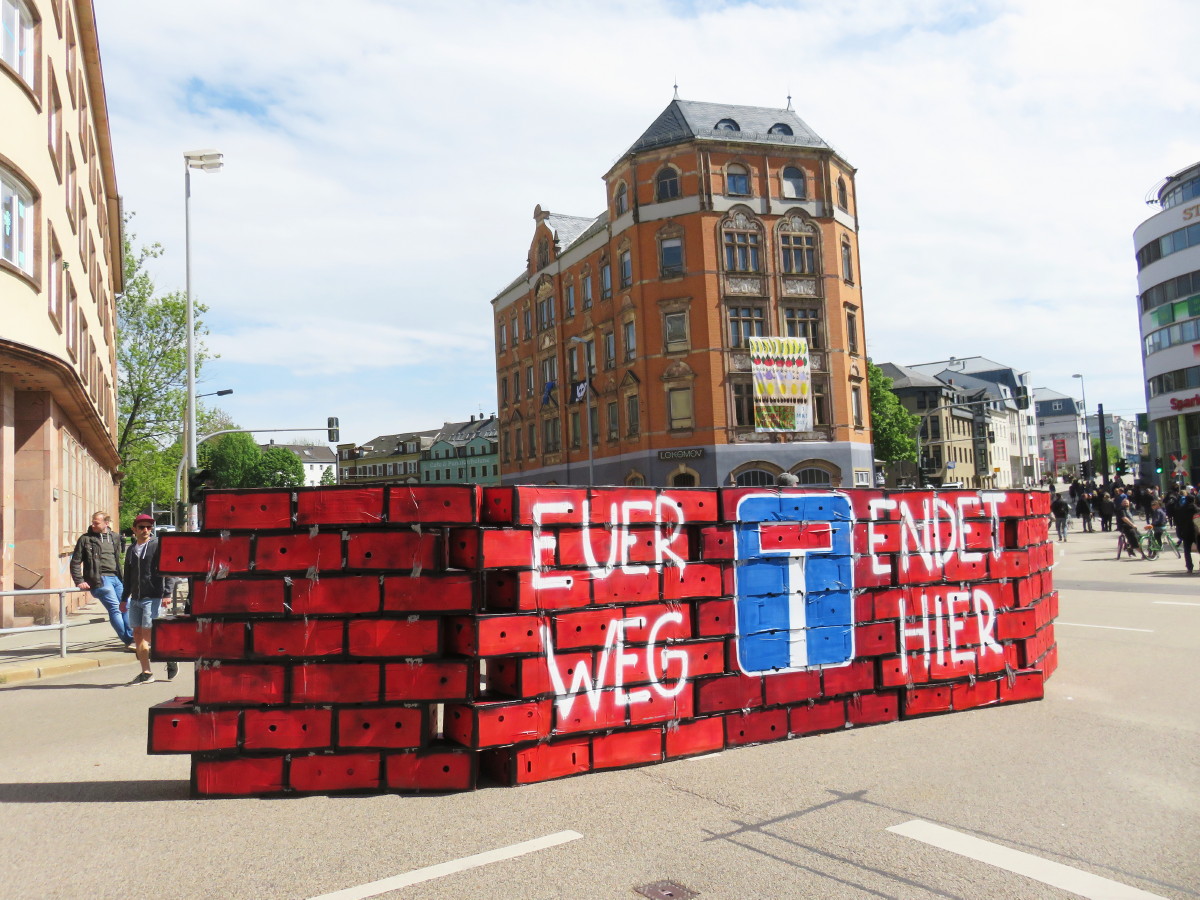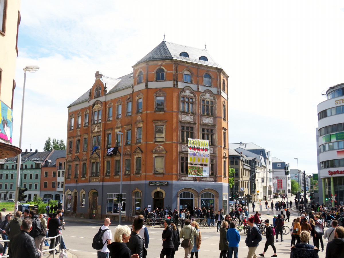 Von dem bunten Balkon in der Fürstenstraße wurden Luftballons herunter geworfen, als die Nazi-Demo vorbei zog: https://twitter.com/twitter/statuses/991288564129390592