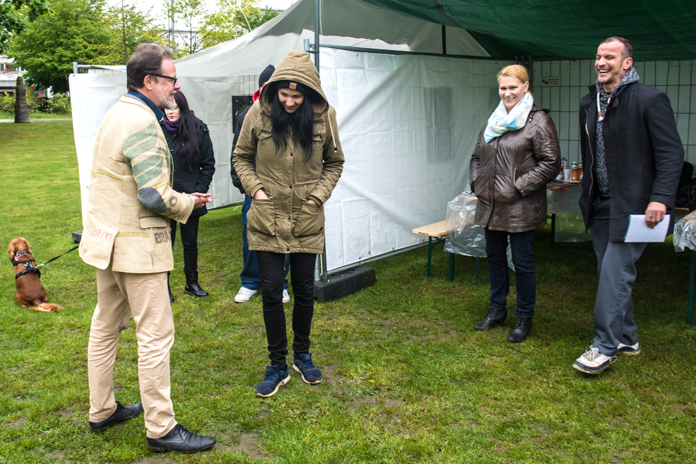 Ein ganz großes Fest der Vereine war seit langem im Stadthallenpark geplant. Doch dann war das Wetter alles andere als festlich. Nach den (viel zu) schönen Wochen im Frühling holte nun der Regen nach, was er versäumt hatte, und dazu zeigte das Thermometer morgens 3 Grad. Totzdem machten sich die allermeisten der angemeldeten Vereine auf den Weg, bauten ihre Stände auf und bibberten auf dem feuchten Rasen.