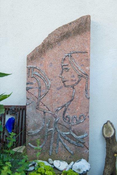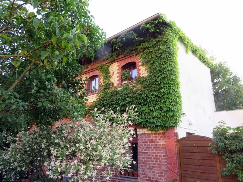 Von der Markusstraße geht man durch die Einfahrt in den Hof mit Carports, deren Holzbau von Klematis und Kletterrosen überwachsen ist. Dahinter erreicht man das zweistöckige Backsteinhaus, eine alte Tischlerwerkstatt. Daneben in der Hälfte der Grundstücksbreite erstreckt sich der private Gartenhof, ein kleines Paradies, abgetrennt durch einen simplen Holzflechtzaun, den Schubert aus dem Baumarkt holte, als das Haus. Weiße Wände, Weinreben, Kräutertöpfe, Steintische und viele Kunstwerke gestalten das Draußen-Wohnzimmer. Praktisches wie ein Liegestuhl oder ein Feuerkorb aus Edelstahl, der von einer Stele übrig geblieben war, wirken in dem Ensemble so ästhetisch, dass ein Arzt zu ihm sagte, zitiert Schubert: „Ihr Künstler stellt altes Zeug hin, und es sieht so toll aus – was habe ich für meine Einrichtung ausgegeben?“ Abgüsse aus Restaurierungsaufträgen an Gründerzeithäusern fanden hier ihren Platz. Oder die halb Meter großen Schachfiguren, die einen aus Edelstahl, die anderen aus Messingblech. Die Geschichte dazu: Schubert hatte sie für einen Patientengarten am Klinikum Flemmingstraße entworfen und realisiert, damit die Patienten draußen Schach spielen konnten. Doch in der Wende starb das Projekt, die Figuren wurden dort eingelagert – und waren verschwunden, als Schubert 1993 nachforschte. Nur die Probestücke waren ihm geblieben.