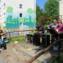 Dann war Eile angesagt, denn es ging weiter zur nächsten und letzten Station Zeißstraße / Orthstraße. Dort wurde auf der grünen Mittelinsel mit den versteinerten Bäumen musiziert.
