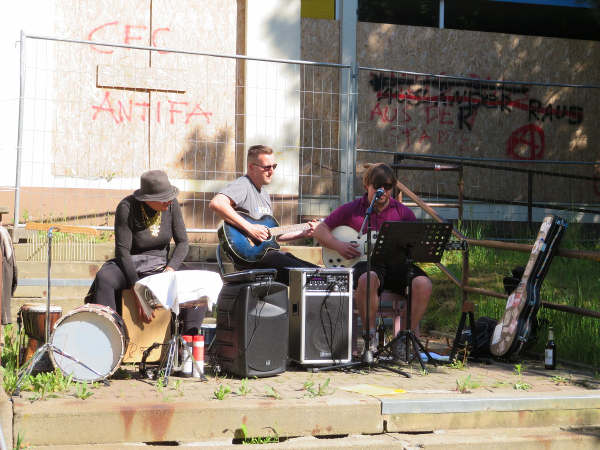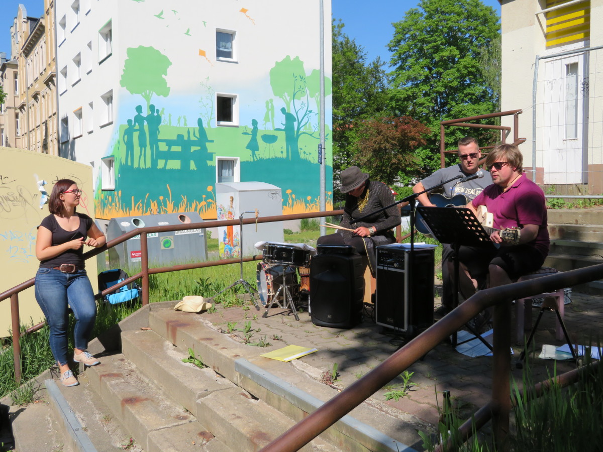 An einem sonnigen Sonnabend der #Coronazeit spielte die Band „Vokanter“ drei Balkonkonzerte. Franziska Degen von der Bürgergerplattform Nord-Ost hatte die ersten drei Konzerte am 16.05.2020 organisiert, war mit vor Ort und unterstützte die Musiker. Die Band Vokanter musizierte zuerst vor dem Bürgerzentrum Sonnenstraße 35. Stadtteilmanager René Bzdok – Gitarre und Gesang – Marcel Wächtler – Gitarre – Svenja Zimmermann – Drums – spielten Lieder verschiedener Genres, angefangen von Volksliedern, „Horch was kommt von draußen rein“ , über „Die Gedanken sind frei“, „ Aber dennoch hat sich Bolle janz köstlich amüsiert“ bis zu „ Griechischer Wein“, Reinhard Mey „Über den Wolken“ und Marius Müller Westernhagen „Wieder zu Hause sein“.
