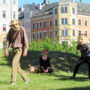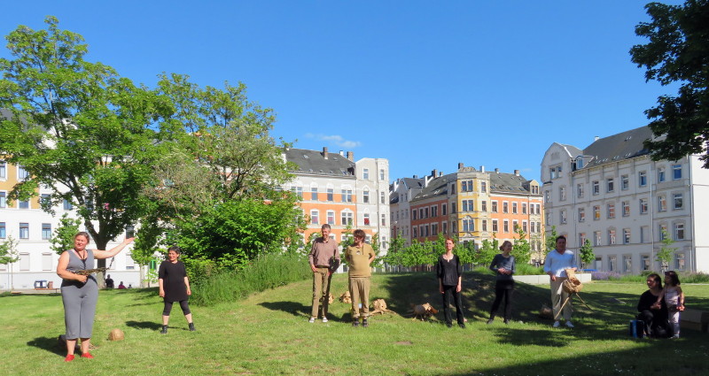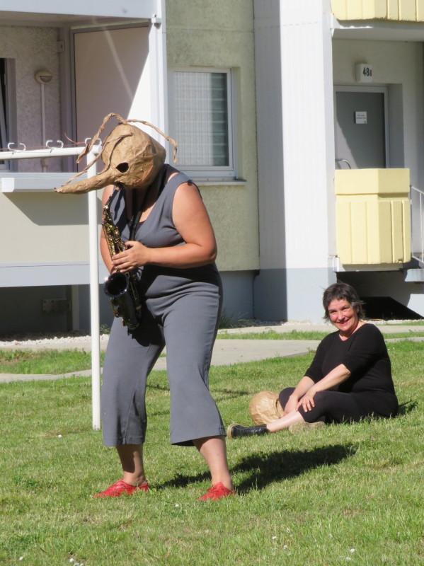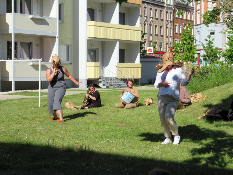 Das Theater KOMPLEX hat ein Maskentheater-Stück für Kinder draußen aufgeführt und viel Freude bereitet. Ein wunderschöner sonniger Pfingstmontagsnachmittag – etwas Musik mit Saxophon, Tamburin, Akkordeon, „Blechtrommel“, dazu acht umherhuschende, schleichende, auf Abstand bedachte KünstlerInnen mit selbstgebastelten Tiermasken. Und ein dankbares Publikum am Kindertag mit sehr vielen Kindern auf der Wiese zwischen Tschaikowskistraße, Fürstenstraße und dem Rüdiger-Alberti-Park, aber auch einige am Fenster oder auf dem Balkon. Und schon hatte das Komplextheater von der Zietenstraße 32 etwas Neues geschaffen und viel Freude bereitet.