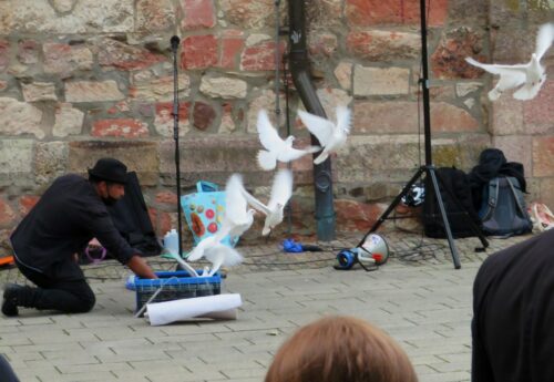 Dieses Symbol für Frieden und Liebe setzte er auch bei einem öffentlichen Anlass ein: Als am 6. Juni 2020 in ganz Deutschland gegen Rassismus protestiert wurde, aus Anlass des von der Polizei ermordeten Floyd George in den USA, ließ er die Tauben bei der Kundgebung vor dem Roten Turm steigen. (Fotos: Eckart Roßberg)