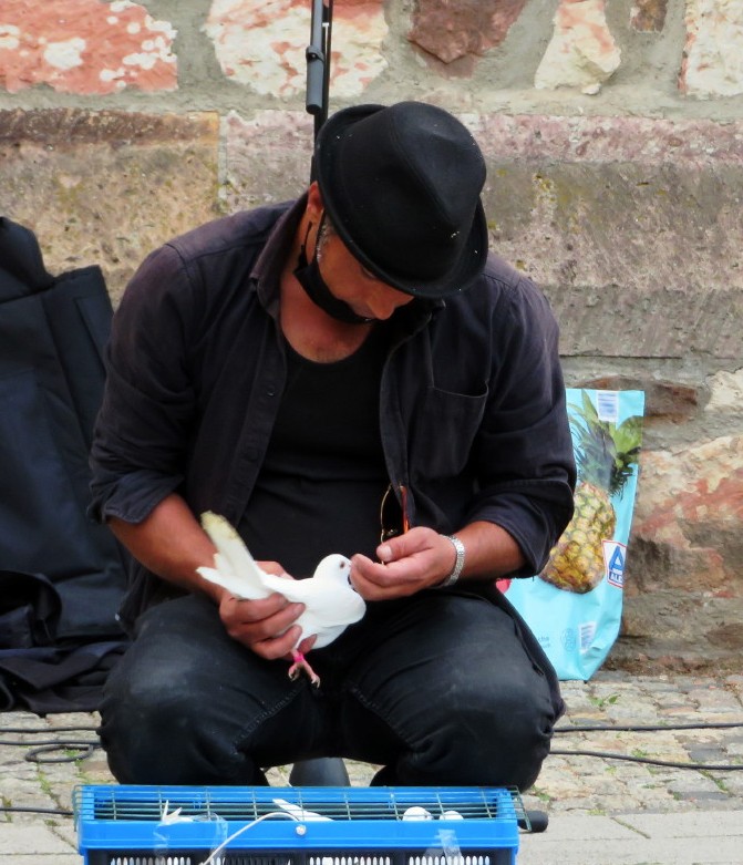 Die Taubenzucht gehört übrigens auch zu seiner Kultur. Und er bietet gleich weiße Tauben für Hochzeitsfeiern an.