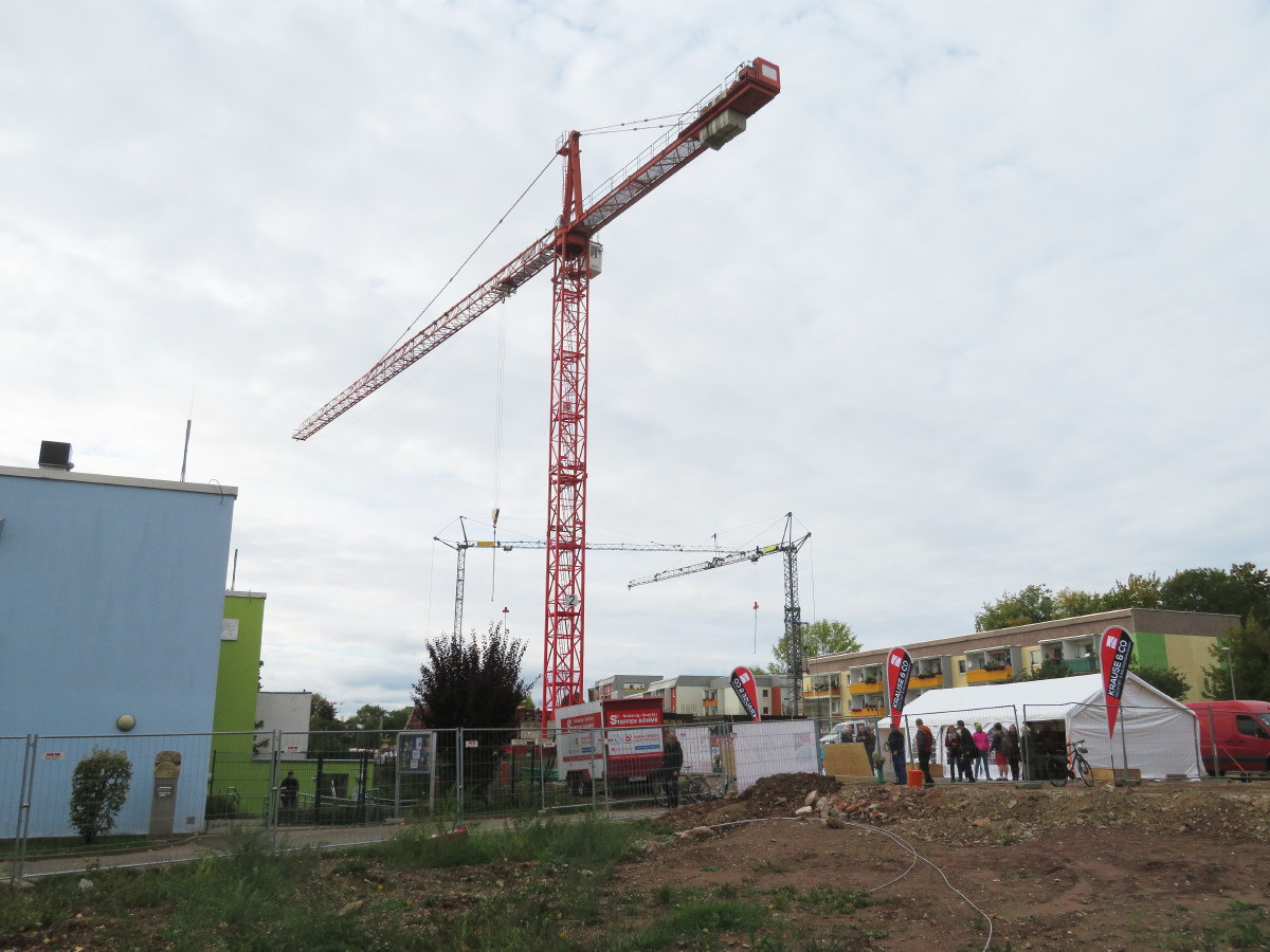 - Mit Kran wird die Grundsteinabdeckung durch Christian Mueller, Steffen Rupf, Susan Einhorn …