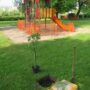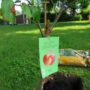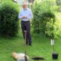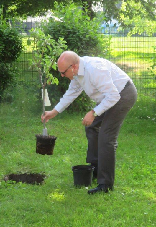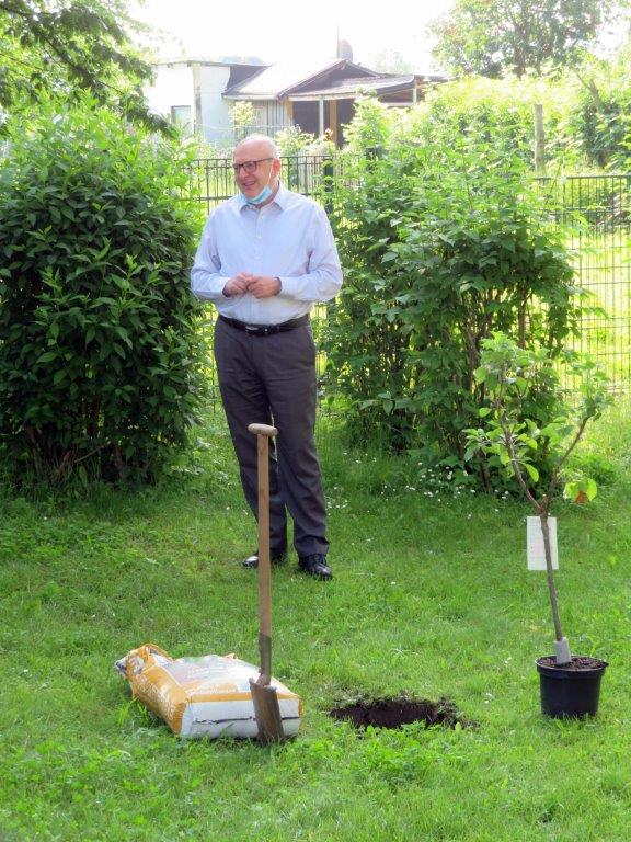 OB pflanzt geschenktes Apfelbäumchen in Kita-Garten