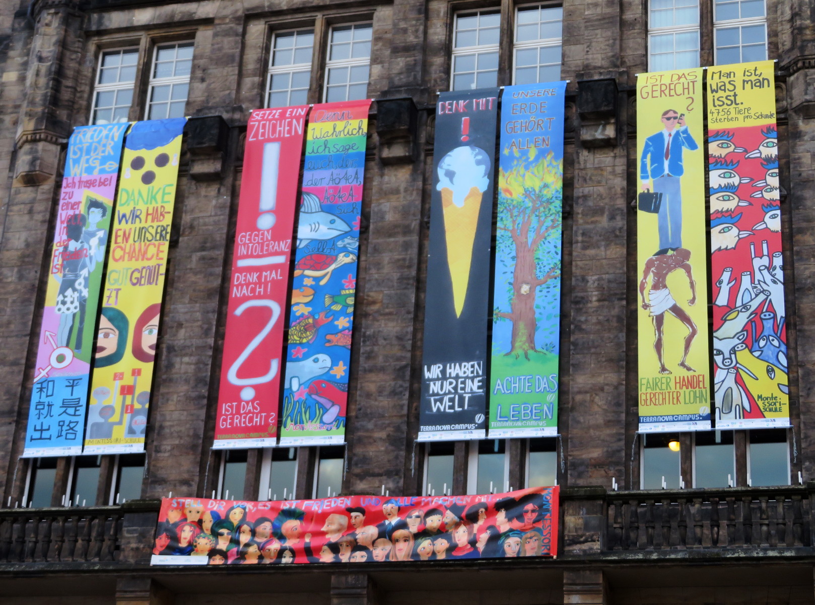 - Friedensbanner von Terra Nova Campus und Montessorischule am Rathaus, Foto: Eckart Roßberg