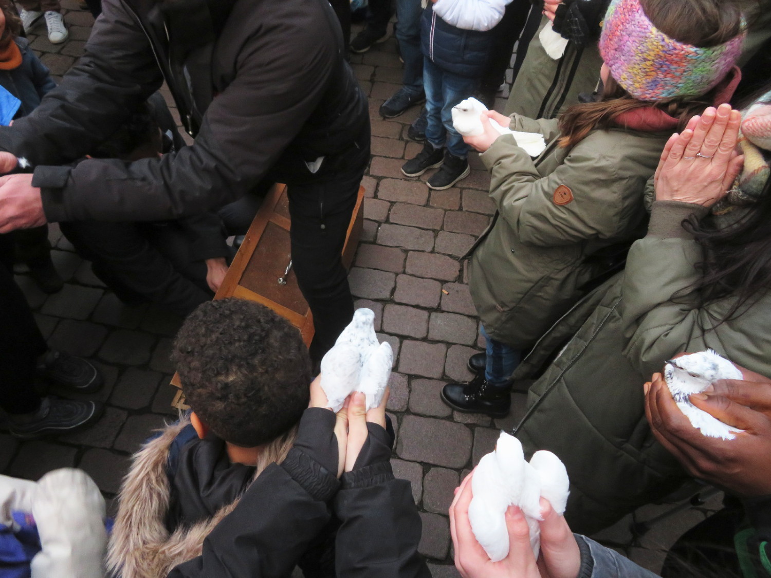 Der Chemnitzer Friedenstag am 05. März anlässlich der Zerstörung von Chemnitz im 2. Weltkrieg, diesmal auch im Gedenken an den Krieg in der Ukraine, wurde von vielen sehr guten Aktionen und Initiativen gegen Krieg und für Frieden gestaltet. Auch der Sonnenberg war durch Adel Matar mit  seinen Tauben vertreten. Bei dieser Aktion gab Adel Matar seine Tauben vorrangig Kindern zum Halten in die Hände. Zum Lied „Kleine weiße Friedenstaube“ , das vom Rathausturm erklang, flogen  die Tauben in den Himmel. Diese tolle Aktion wurde von Pfr. i.  R. Stephan Brenner moderiert, der sich schon lange beim Friedenstag engagiert.