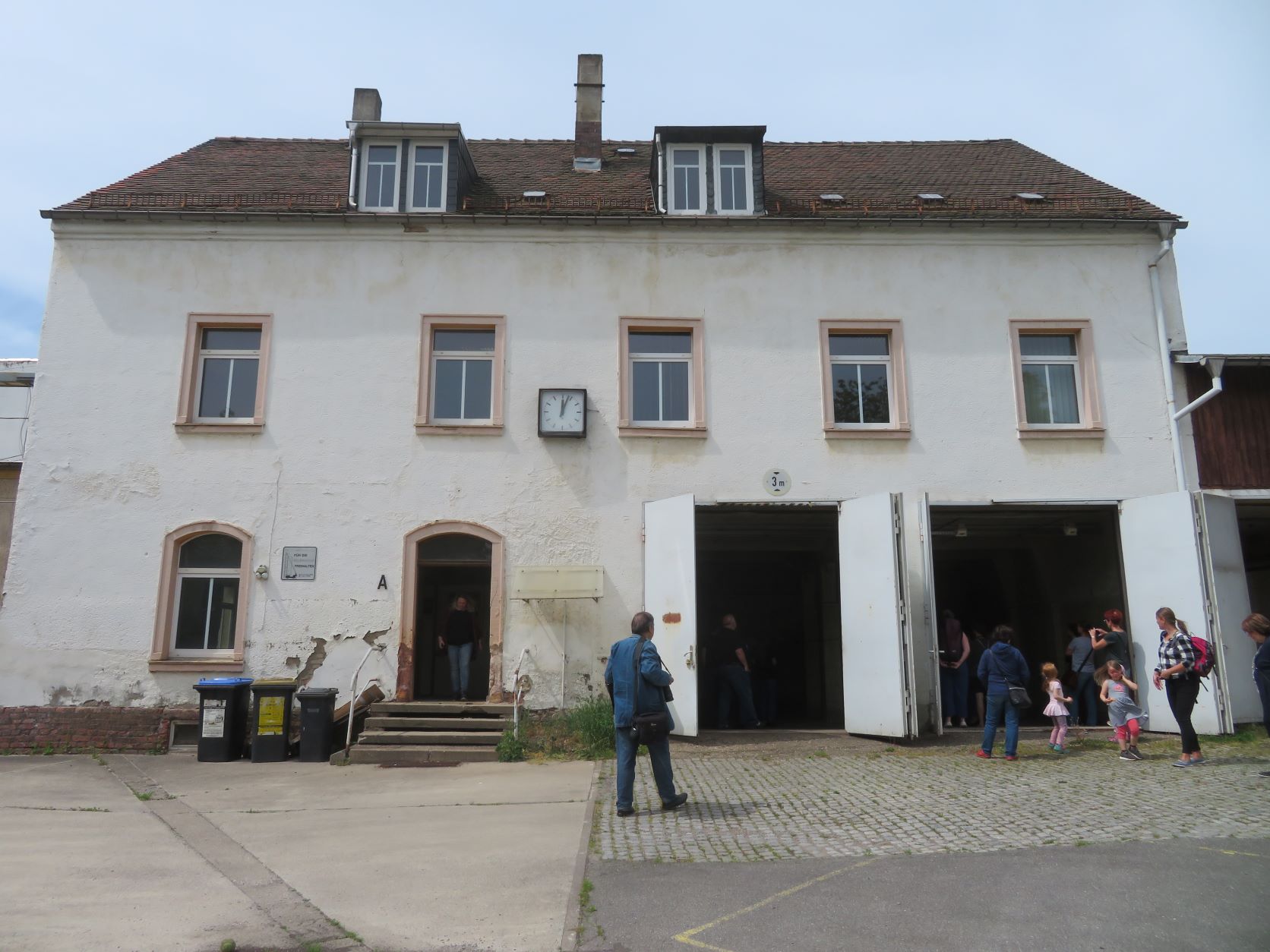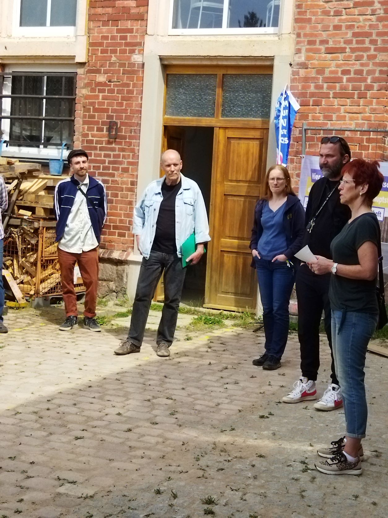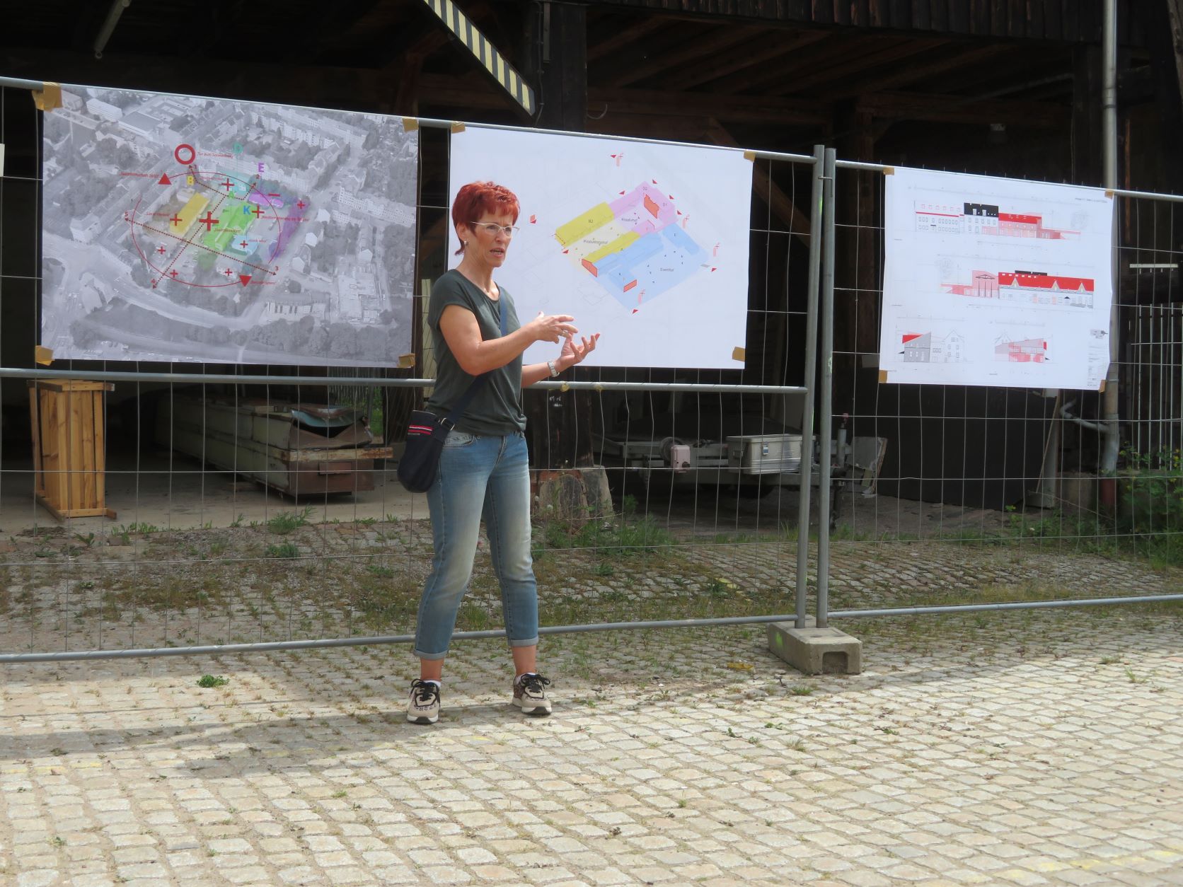 Zurück auf dem Hof zeigte Frau Stillger anhand von Plänen den angedachten weiteren Ausbau und die Gestaltung des Geländes.Sie verwies auf die in den kommenden Monaten stattfindenden Workshops, in denen gemeinsam mit NutzerInnen, Interessierten und der Stadtbevölkerung die künftige Gestaltung der Höfe, Zugänge und Stadtwerkstätten sowie die künftige gemeinschaftliche Betreibung entwickelt werden soll. Die sehr interessante Veranstaltung wurde mit Einblicken in einen Teil der Räumlichkeiten der Häuser B, ehemalige Werkstätten und A, ehemaliges Kutscherhaus von 1930 mit Garagen, abgerundet.