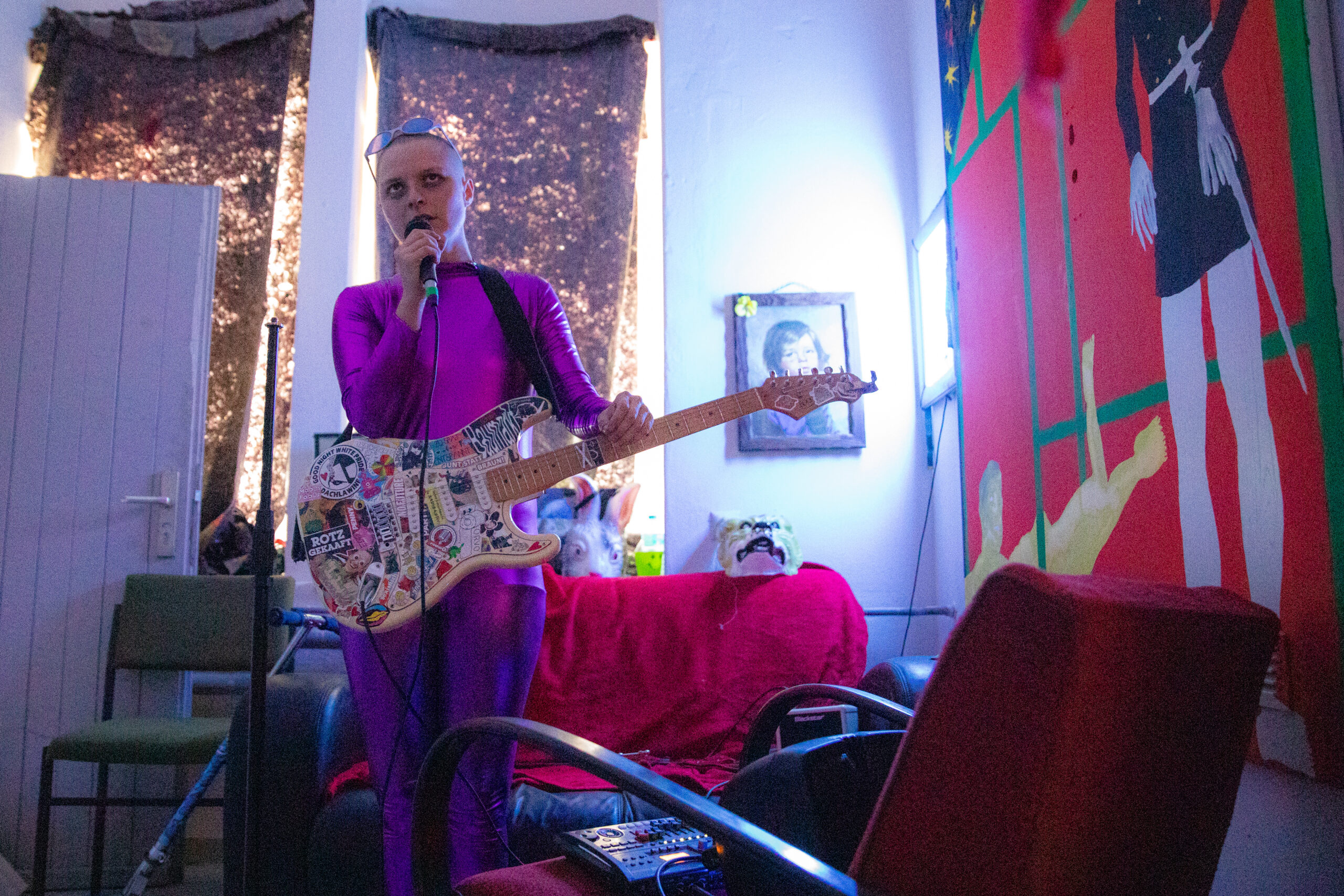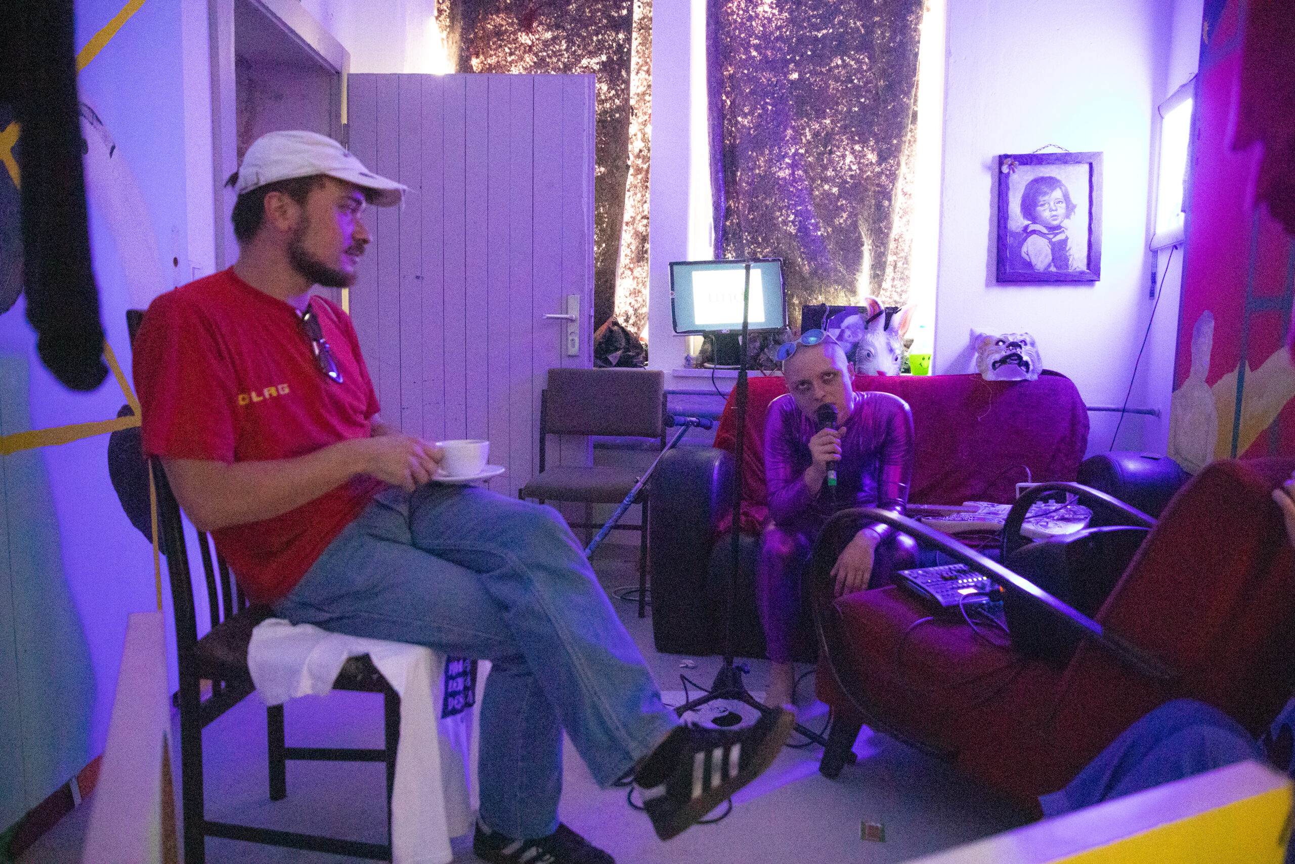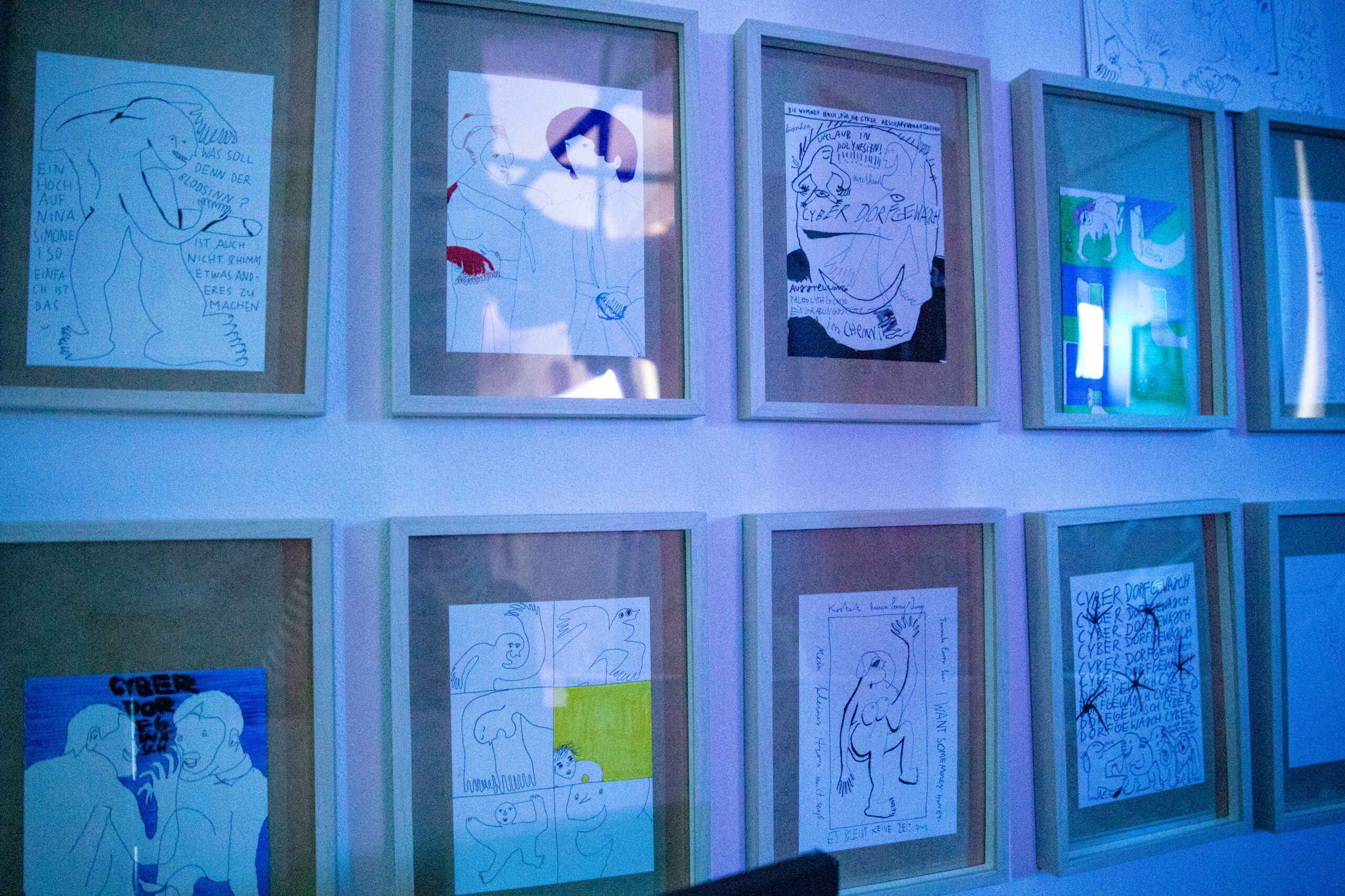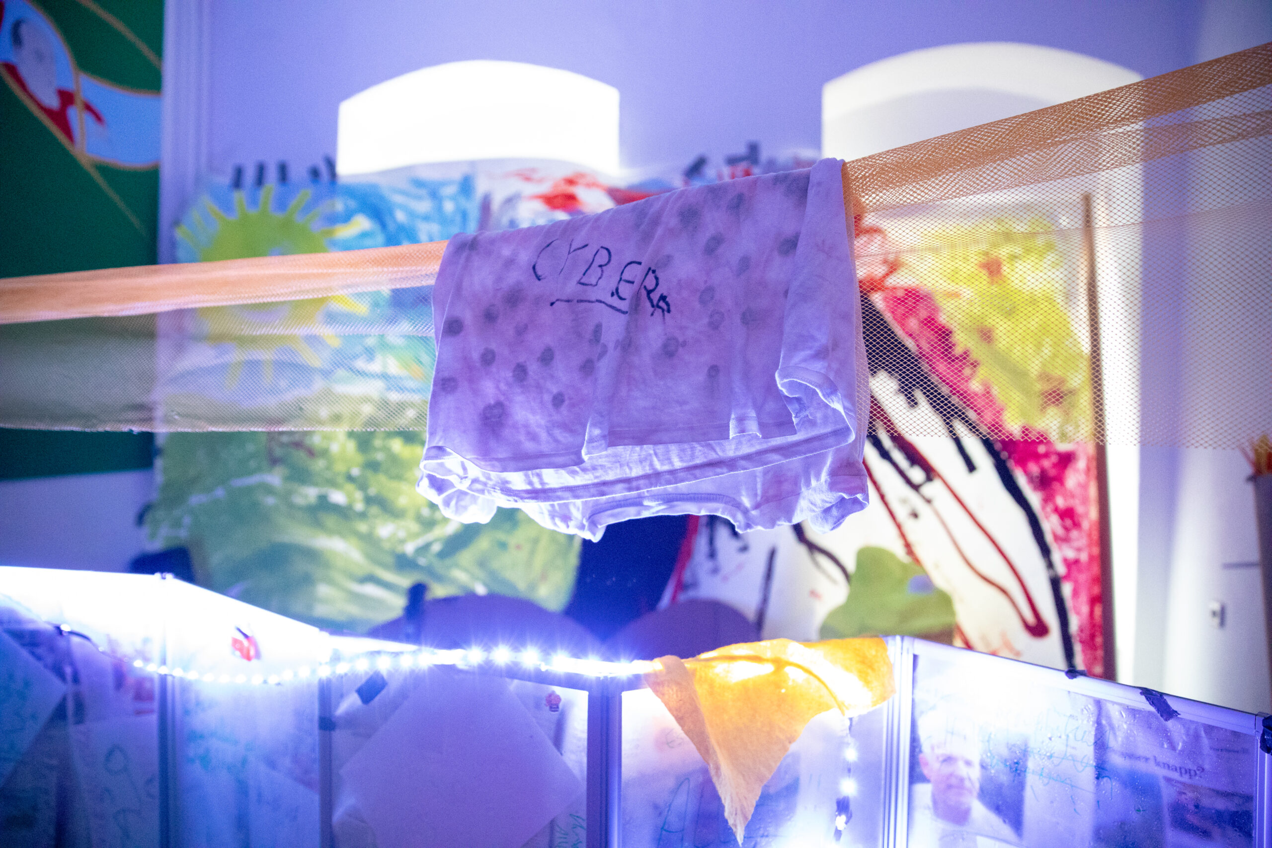 Jens Ausderwäsche, die 2021 bis 2023 an einem Zyklus namens „Cyber-“arbeitete, in dem Sie Alltäglichkeiten bis hin zur Ich-Auflösung in 7 Alben verarbeitet und dokumentiert, zerlegt und seziert diesen nach dessen Beendigung im März 2023 in der Ausstellung „CYBER DORFGEWÄSCH“ zusammen mit Laurin Erdmann wieder. Um sich selbst kreisend, wird der essenzielle zwischenmenschliche Horror aus dem Album-Zyklus in der Person „Cyber Grusel“,die immer wieder kleine Performance-Filme schiebt oder aus Scham und Eitelkeit auslässt. Textlich setzen sich bestehende Satzgefüge in absoluter Beliebigkeit permanent neu zusammen und musikalisch entblättert es sich, indem unbearbeitete Spuren kontextlos und einsam vor sich hin plärren und zum Teil die fertigen Songs, die vehement und ohne Unterlass durchrattern, übertönen.