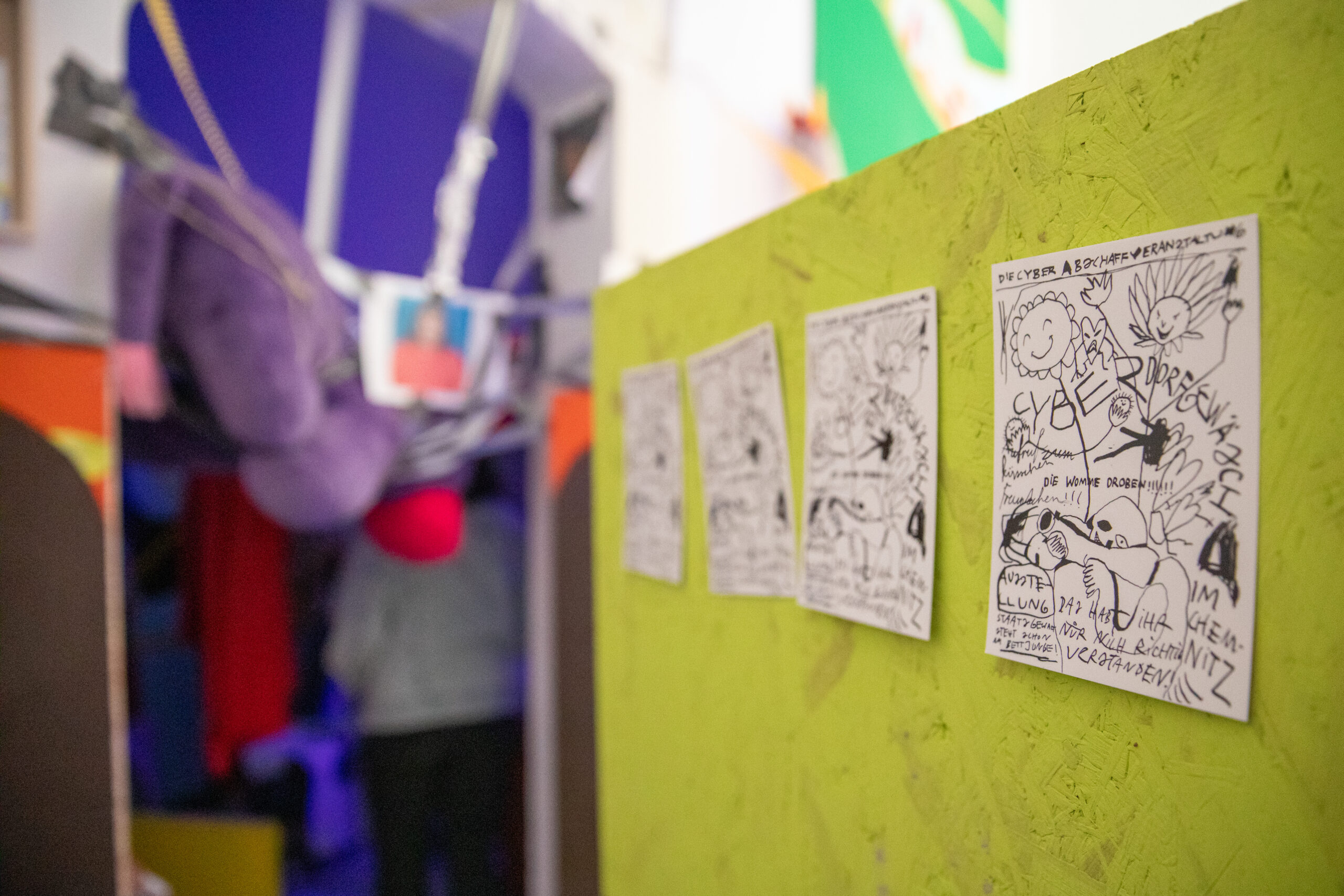 Die Ausstellung ist eine Zusammenarbeit von Jens Ausderwäsches Cyberuniversums-Listening Techniken und Laurin Erdmanns verbindlichen Grobian-Grafiken mit Entschuldugungscharakter und auch noch Vielem mehr.“