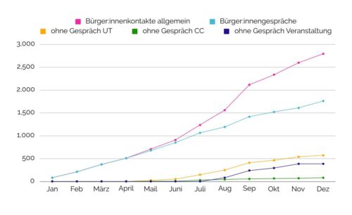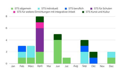 Des Weiteren ermöglichte es uns das Format der Stadtteilspaziergänge (STS) gut mit den Chemnitzer:innen in Kontakt zu treten. Insgesamt waren wir 28x im Zentrum und auf dem Sonnenberg mit Euch im vergangenen Jahr unterwegs. Dabei wurden auf beruflicher oder individueller Ebene, sowie für den allgemeinen ersten Einblick in Chemnitz passende Anlaufstellen und relevante Orte zum Ankommen, Kontakte knüpfen und den beruflichen Einstieg gemeinsam erkundet.