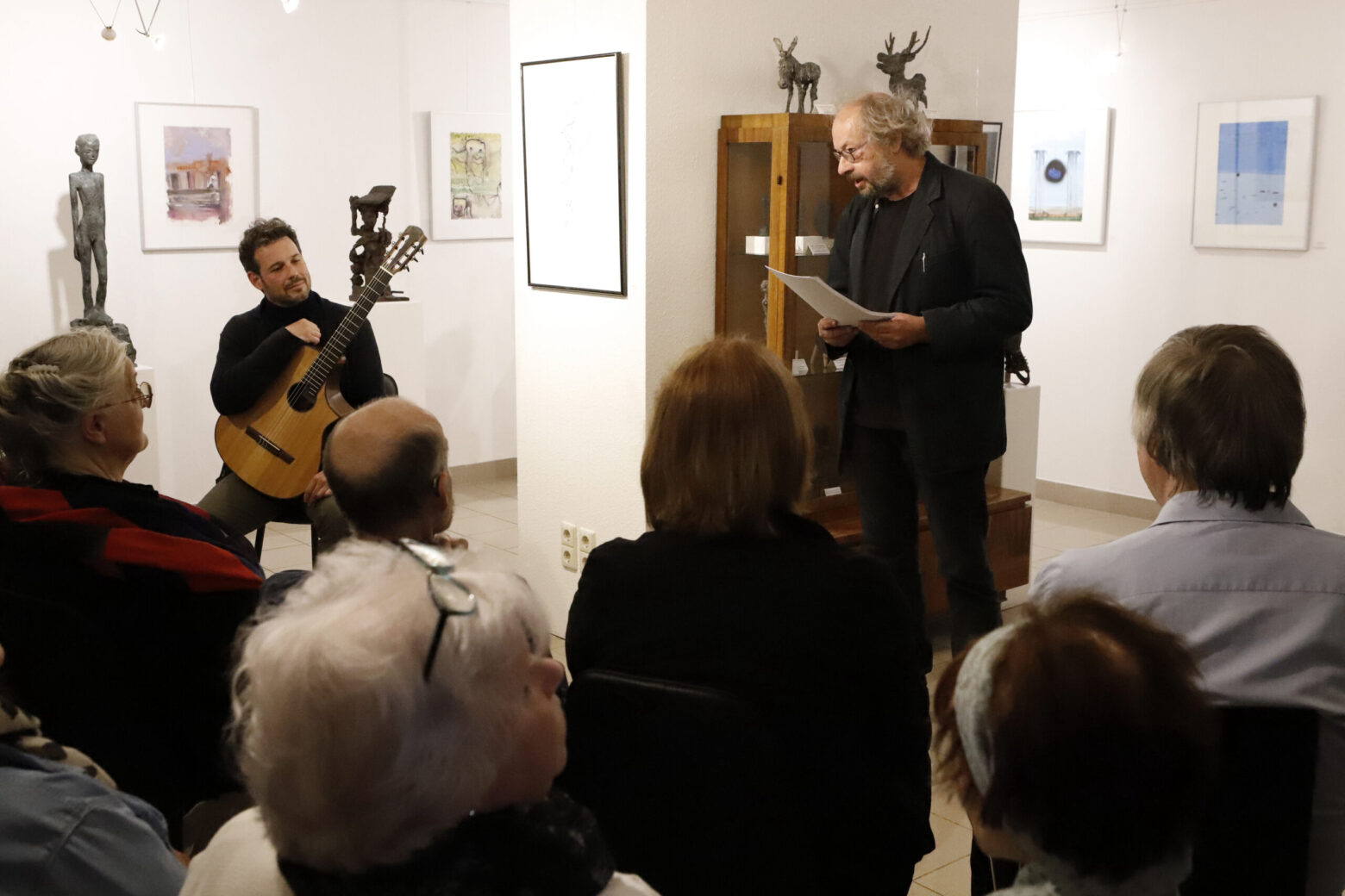 Matthias Zwarg führte in in seiner Laudatio in die Werke ein. Sie seien sich auf den zweiten Blick nahe, weil die Künstler interessiere, „was Menschen bewegt, was sie traurig und froh macht, was sie bedrückt, verärgert, verunsichert, was sie bedroht und was sie hoffen lässt, was sie dumm und klug werden lässt, was sie vergessen und erinnern.“