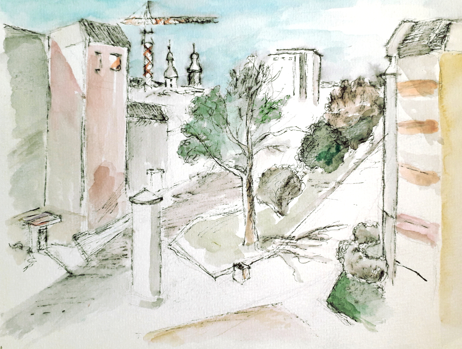 Blick von einem Balkon an der Sonnenstraße, Zeichnung von Stephan Weingart