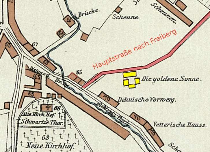Standort des früheren Gasthofs „Zur Goldnen Sonne“ an der Freiberger Straße, Foto: Stephan Weingart