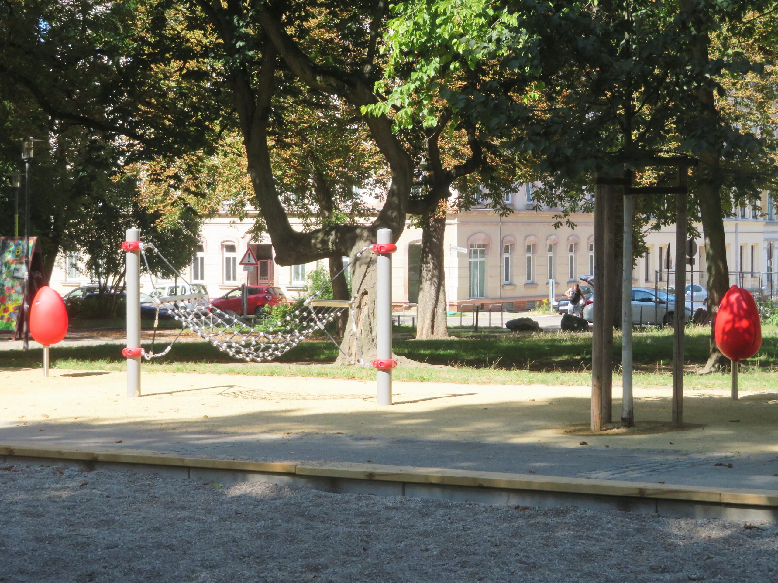 Der Lessingplatz ist ein Ort der Begegnung – Menschen unterschiedlichen Alters und Nationalitäten kommen hier zusammen. Zur Erholung, zum Fußballspielen oder einfach zum Plaudern. Läuft man an einem schönen Sommernachmittag über den Platz, zeigt sich einem ein lebhaftes Bild. Kinder mit schweren Schulranzen auf dem Rücken rennen schnell nach Hause, um diesen dort in die Ecke zu stellen und sich gleich wieder hier zu treffen, zum Kicken versteht sich. Mütter sitzen mit ihren Kleinkindern am Sandkasten und schaufeln diesen in Eimer. Zwei Mädchen schaukeln um die Wette, wer es wohl am höchsten schafft. Vielleicht war es genau dieses Bild, was die Teilnehmenden des ersten Bürgerforums im August 2019 vom denkmalgeschützten gründerzeitlichen Platz hatten, als es darum ging, eine Interventionsfläche im Stadtgebiet Nord-Ost für das Kulturhauptstadtjahr zu finden. Nun, fünf Jahre später, hat der Lessingplatz eine umfassende Aufwertung mit neuen Sitzgelegenheiten und zahlreichen Spiel- und Sportmöglichkeiten zum Hüpfen, Balancieren oder Klettern erfahren. Freigegeben wurden die Spielbereiche auf der Ost-West-Achse am 23. August dieses Jahres, was zwei Tage später mit einem Kinderfest dank des Engagements zahlreicher Akteure aus der Soziokultur gebührend gefeiert wurde. Organisationen wie AJZ Streetwork, AJZ Bauspielplatz, Blessing, Stadtteilpiloten, Kita Sonnenbergstrolche, Erika e.V. und das Bandbüro Chemnitz boten nicht nur an diesem Tag ein vielfältiges Programm, sondern begleiteten und unterstützten den Beteiligungsprozess über die letzten Jahre hinweg. Auch das Stadtteilmanagement unterstützte.