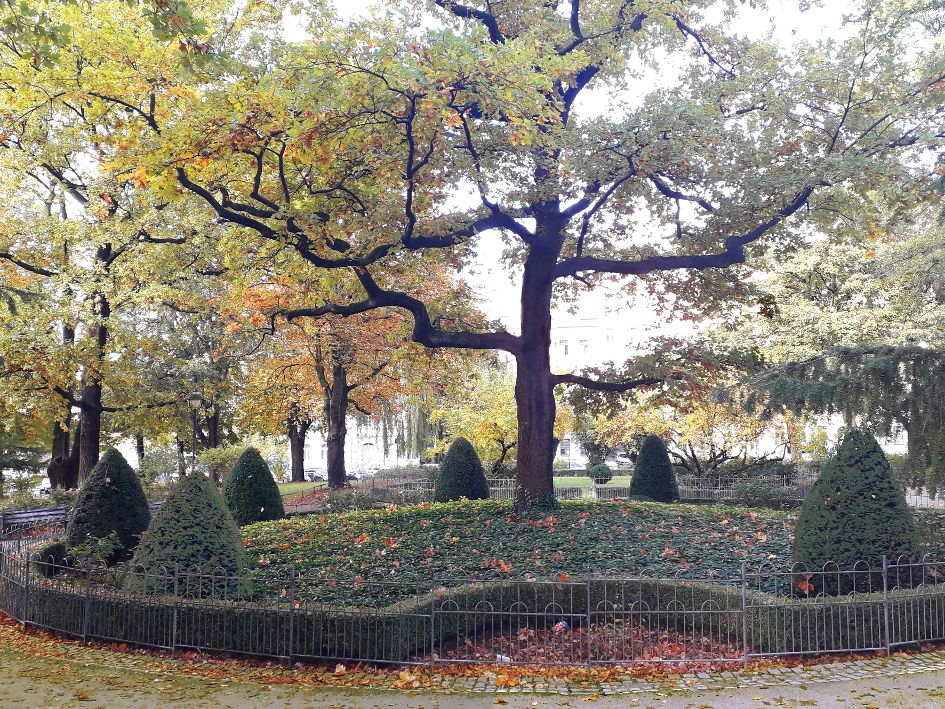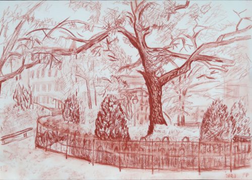 In der Nähe unseres Ateliers 8-80 liegt der Theodor-Körner-Platz. Dort befindet sich ein kleine Park. Auf dem Weg zum Atelier komme ich oft an ihm vorbei. Je nach Jahreszeit und Wetter konnte ich im Park menschenleer oder auch als Ort der Ruhe und Erholung erleben. Darin spazieren Mütter mit ihren Kinderwagen. Hundebesitzer führen ihre Vierbeiner aus. Auf den Bänken ruhen sich Leute aus oder unterhalten sich miteinander. Kindergruppen durchqueren den Park auf ihrem Weg zur Oberschule „Am Körnerplatz“. Auch unsere Malgruppe hielt sich so manches Mal darin auf. So entstand vor kurzem meine Rötelzeichnung. Was macht den Ort so besonders? Es ist nicht nur die räumliche Nähe zu unserem Atelier. Je nach Standpunkt sind die anliegenden Häuser, die Oberschule, die St. Markuskirche durch den Park zu sehen. Spannend finde ich, die Anlage an sich zu erkunden. Der Park hat eine ungefähre Form eines Rechtecks. In seinem Zentrum befindet sich eine kreisförmig angelegte, bepflanzte Fläche. In dessen Mittelpunkt steht auf einer kleinen Erhebung ein Baum, die „Körnereiche“. Von den Eckpunkten des Parks führen Wege, die wie Diagonalen angelegt sind, zum Zentrum und wieder heraus. Drei der gedanklich entstandenen Dreiecke sind wieder durch Wege unterbrochen. Zwei davon haben Treppen. Eine führt hinab in den Park, die andere hinauf. Diese Wege gehen in runde Formen über. Umzäunte Flächen wechseln mit freien und durch niedrige Geländerumgebenen Flächen ab. Es sind Rasenstücke, ornamentförmig angelegte Hecken, Sträucher, Blumen und Bäume zu finden. Dieser Park mit seiner fast streng geometrischen Gestaltungerinnert mich an einen „französischen Garten“. Er wirkt auf mich wie eine Hommage an die Gestalter der ersten Barockgärten.