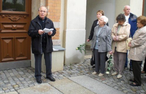 7. Oktober 2008 Ludwig-Kirsch-Straße 1, Siegmund Rotstein (1925 – 2020) spricht bei der Verlegung des Stolperstein für seinen Vater Jankel Rotstein