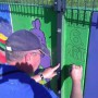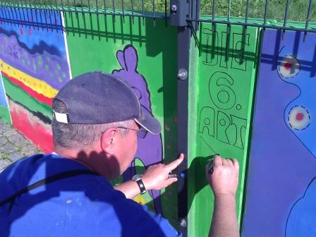 Auf der einen Seite am Betonsockel des Ballspielplatzes haben sie ihre eigenen Bilder gemalt und signiert. Auf der anderen Seite haben sie ihre erste Graffiti-Schulung erlebt: Friedrich Benzler hatte die Konturen eines Drachen angebracht, welche die Kinder unter Anleitung mit vielen bunten Schuppen ausfüllten.