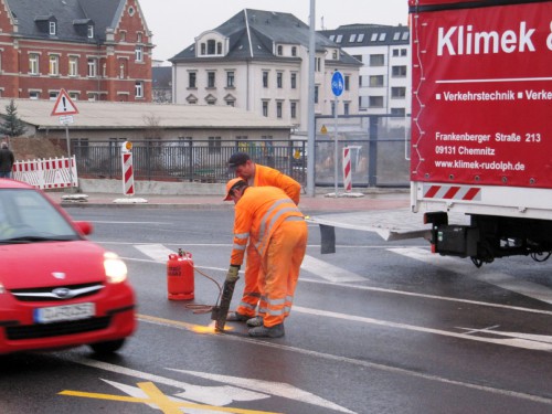 Klimek und Rudolph beseitigen die gelben Fahrbahnmarkierungen