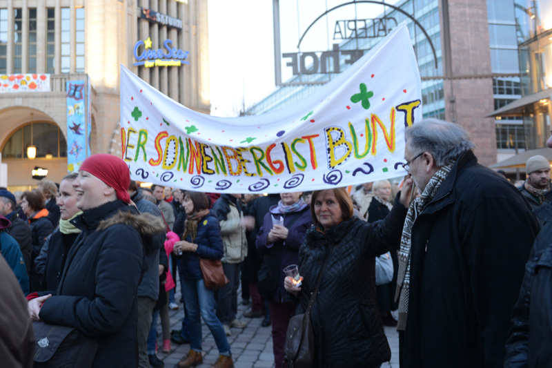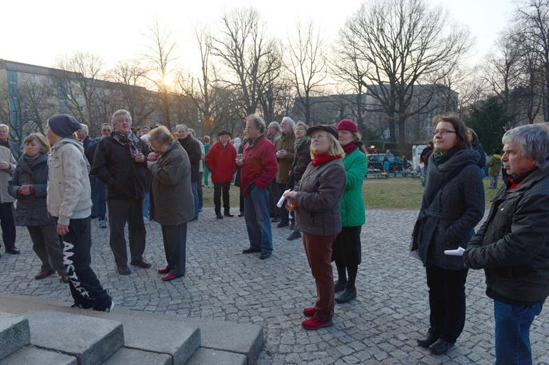 „Den Termin 5. März hatte ich mir gleich eingetragen, der ist auch bei uns in der Schule ein großes Thema“, meinte ein zugezogener Referendar aus dem Goethe-Gymnasium. Auich wenn er in seiner knappen Freizeit meist in Leipzig unterwegs ist und seine Zeit in Chemnitz schon bald zu Ende ist, so nutze er doch den Sternmarsch, um mit den anderen Stadtteilbewohnern gemeinsam ein Zeichen für den Frieden zu setzen.