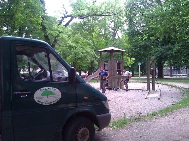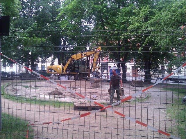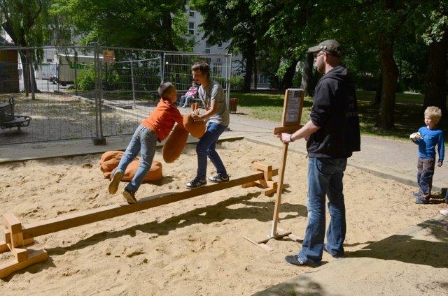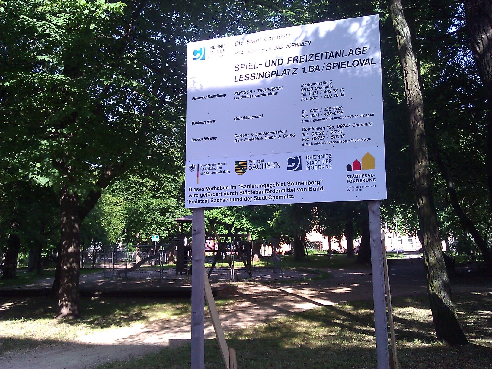 Nachdem auf Druck der Sonnenberger die Stadt zugesagt hatte, die Sanierung des Spielplatzes schneller zu beginnen als ursprünglich geplant, warteten vor allem die Kinder von Tag zu Tag auf den Beginn der Arbeiten. Am 22. Mai war die letzte Beratung mit Bernhard Herrmann, dem „Sachkundigen Bürger“ im Stadtratsausschuss, und Amtsvertreterinnen auf dem Platz. Am 6. Juni wurde die Bautafel aufgestellt. Und am 17. Juni wurden die alten Geräte abgebaut, in den Tagen danach der Kies weggebaggert.