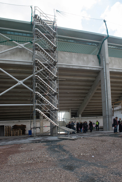 Sehr interessant war, wie vom Projektleiter Kay-Uwe Panzer der sehr enge und komplizierte Bauablauf erläutert wurde, da die Bauarbeiten bei vollem Spielbetrieb stattfinden und es keinerlei Behinderung und Gefährdung der Zuschauer geben darf und die Bestimmungen des Deutschen Fußballbundes eingehalten werden müssen. Das betraf auch die Inbetriebnahme der Südtribüne, die mit Teilabnahmen freigegeben wurde. Für die Ost- und Westtribüne kommt da noch einiges auf die Bauleute zu.