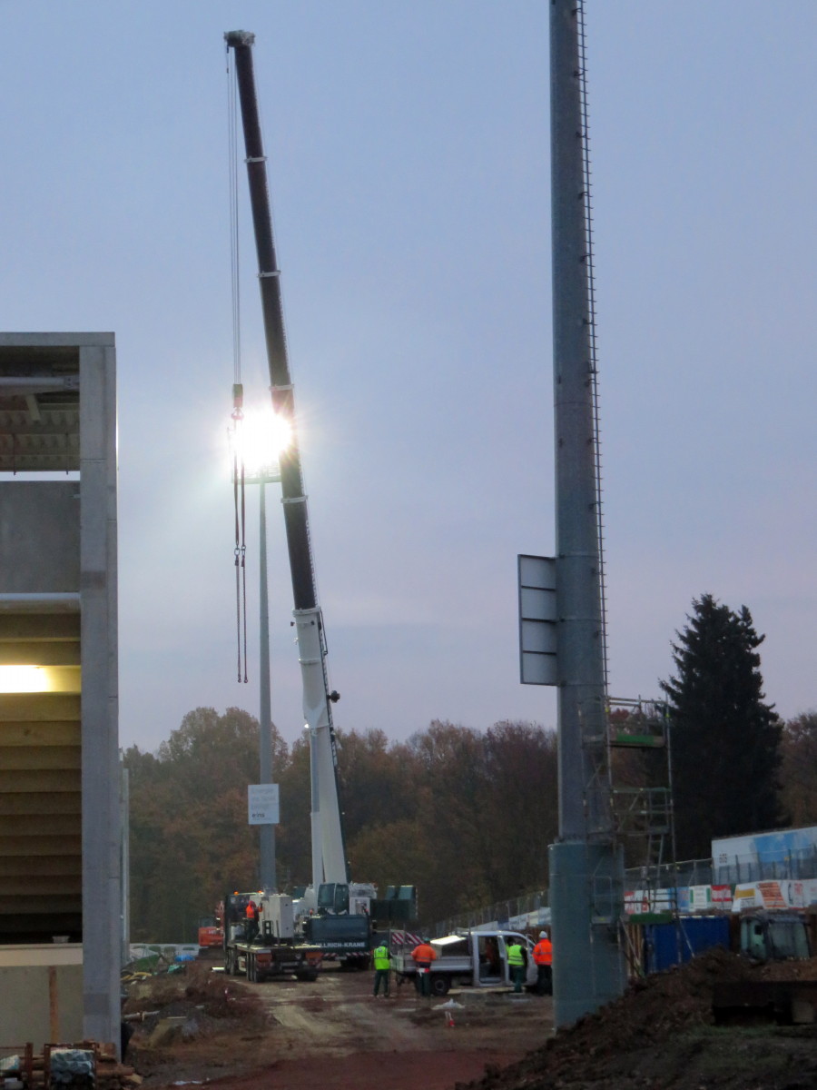 Er berichtet: „Die Medien sind alle verlegt. Das letzte Fundament wurde heute morgen ausgeschalt. Da es auch für den einen oder anderen interessant ist, habe ich auch einmal von der Höhe der Süd- und Nordtribüne die Osttribüne fotografiert. Am Schluss des heutigen Arbeitstages waren dann immerhin schon fünf Stützen montiert.“ An der Westtribüne wird das Dach weiter abgetragen, so dass das Dach im Dezember planmäßig abgetragen sein wird.