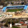 Für das Hauptgebäude am Stadion wird am Rohbau gearbeitet. Auf der sich davor befindenden Westtribüne wird unterdessen ein Teil bereits mit Tribünenplatten belegt.