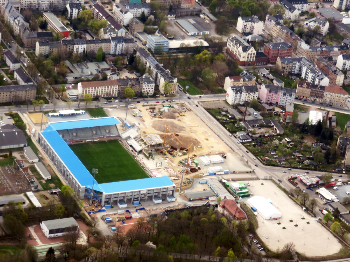 Über den Stand der Arbeiten auf der Stadionbaustelle an der Gellertstraße und den Projektfortschritt hat Oberbürgermeisterin Barbara Ludwig am 28.4.2015 turnusgemäß den Planungs-, Bau- und Umweltausschuss informiert. Eckart Roßberg hat die Fotos.Das passiert derzeit: Hinter der Nord- und Südtribüne sind die Vorbereitungen für die Umzäunungen in vollem Gange. Im Eingangsbereich der jeweiligen Tribüne befindet sich bereits die Vereinzelungsanlage inklusive Zaunführung und Überdachung im Bau.