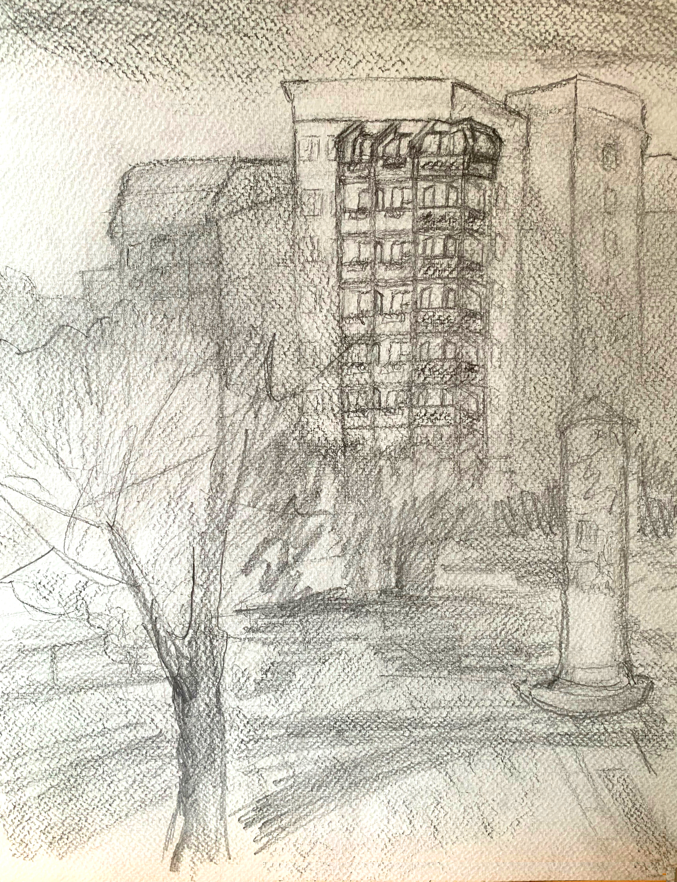 Blick von einem Balkon an der Sonnenstraße, Bleistiftzeichnung von Birgit Meier